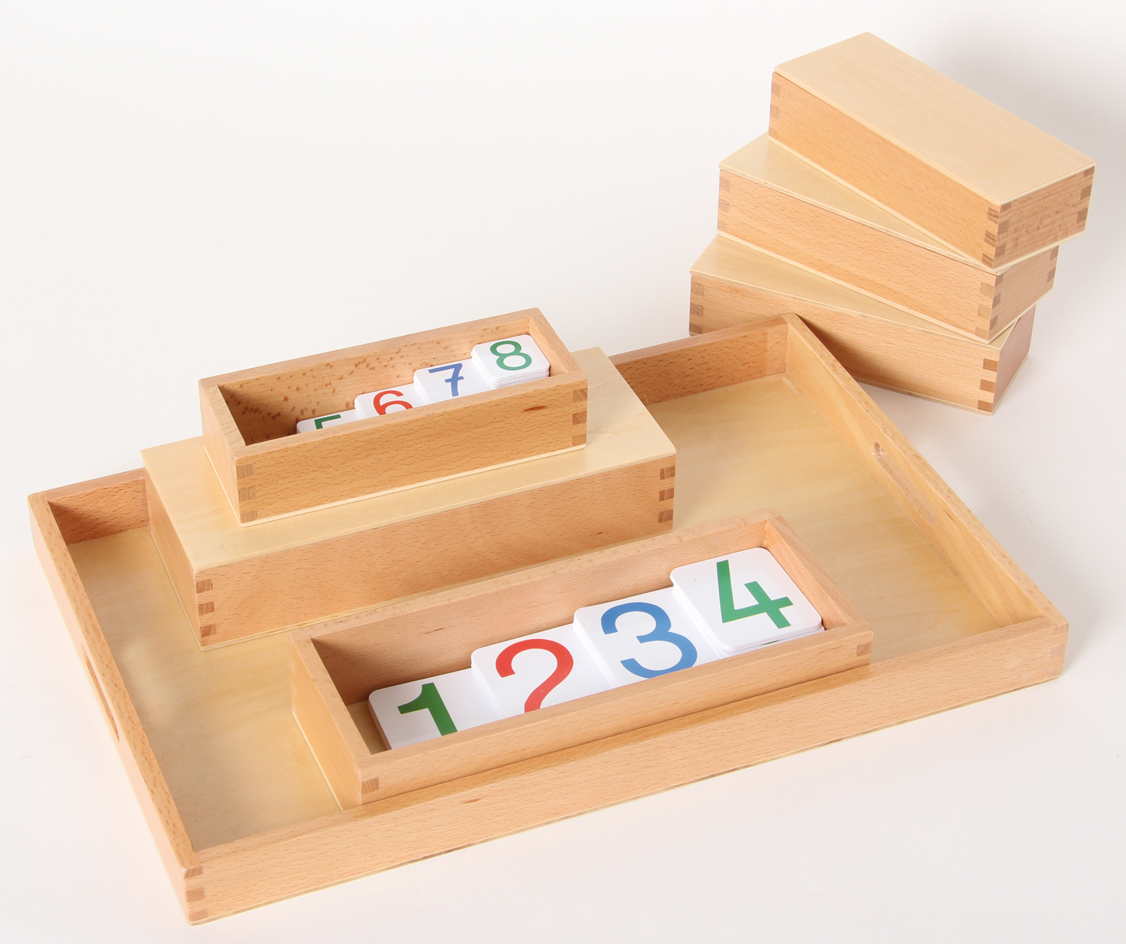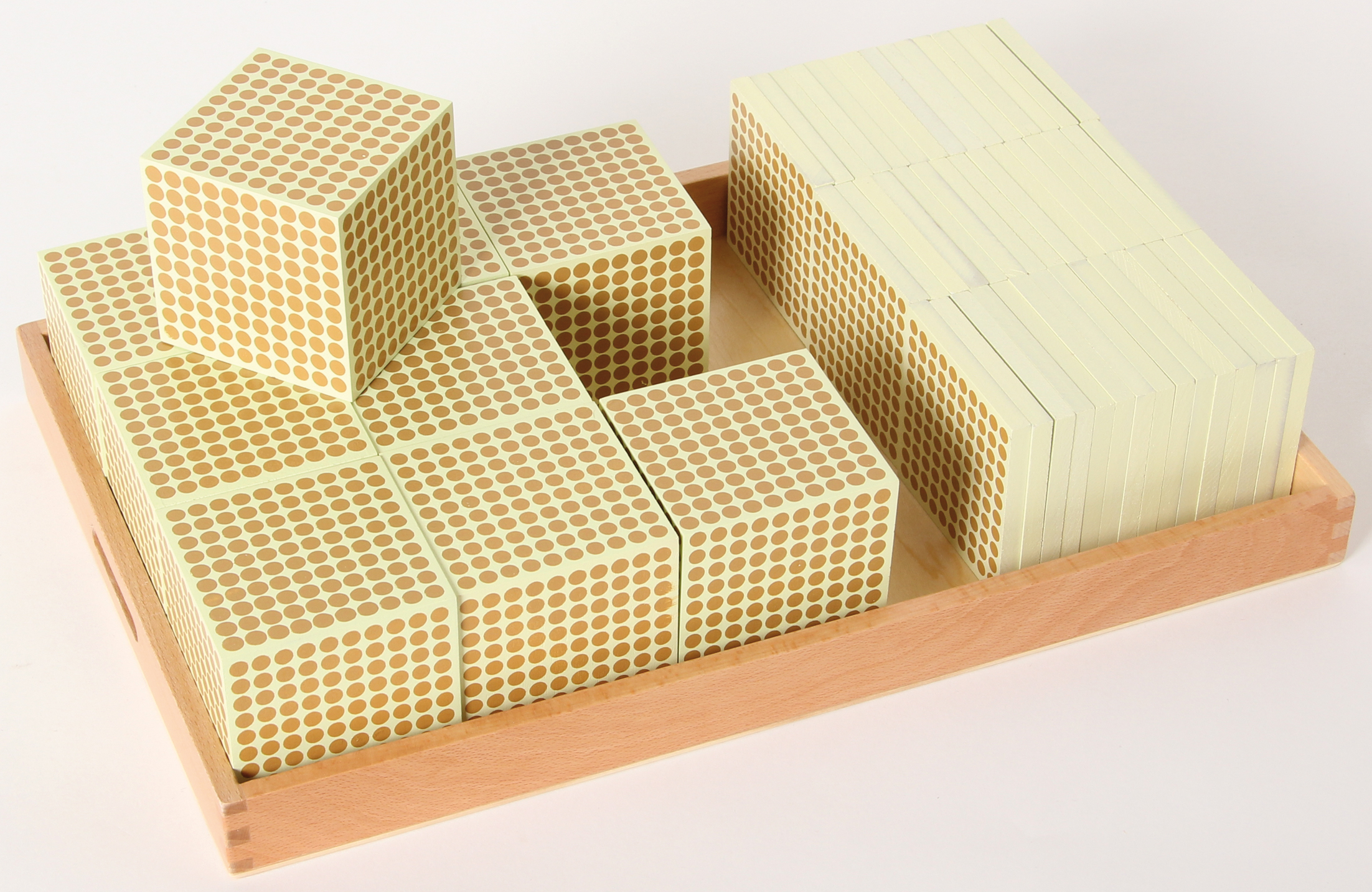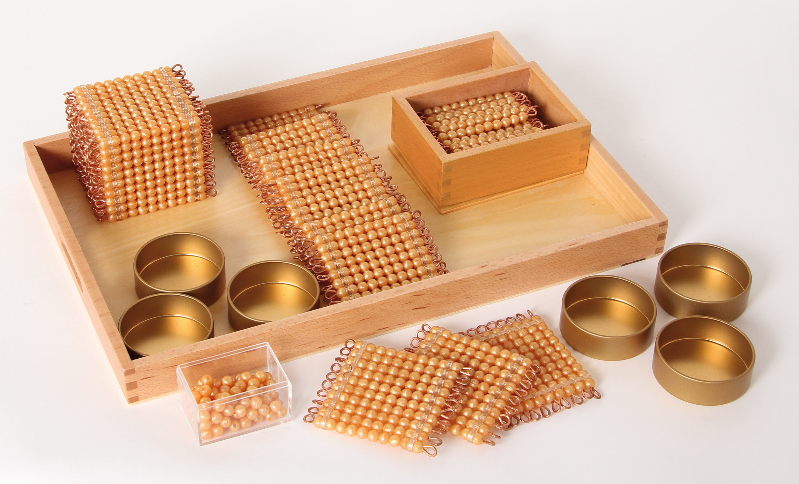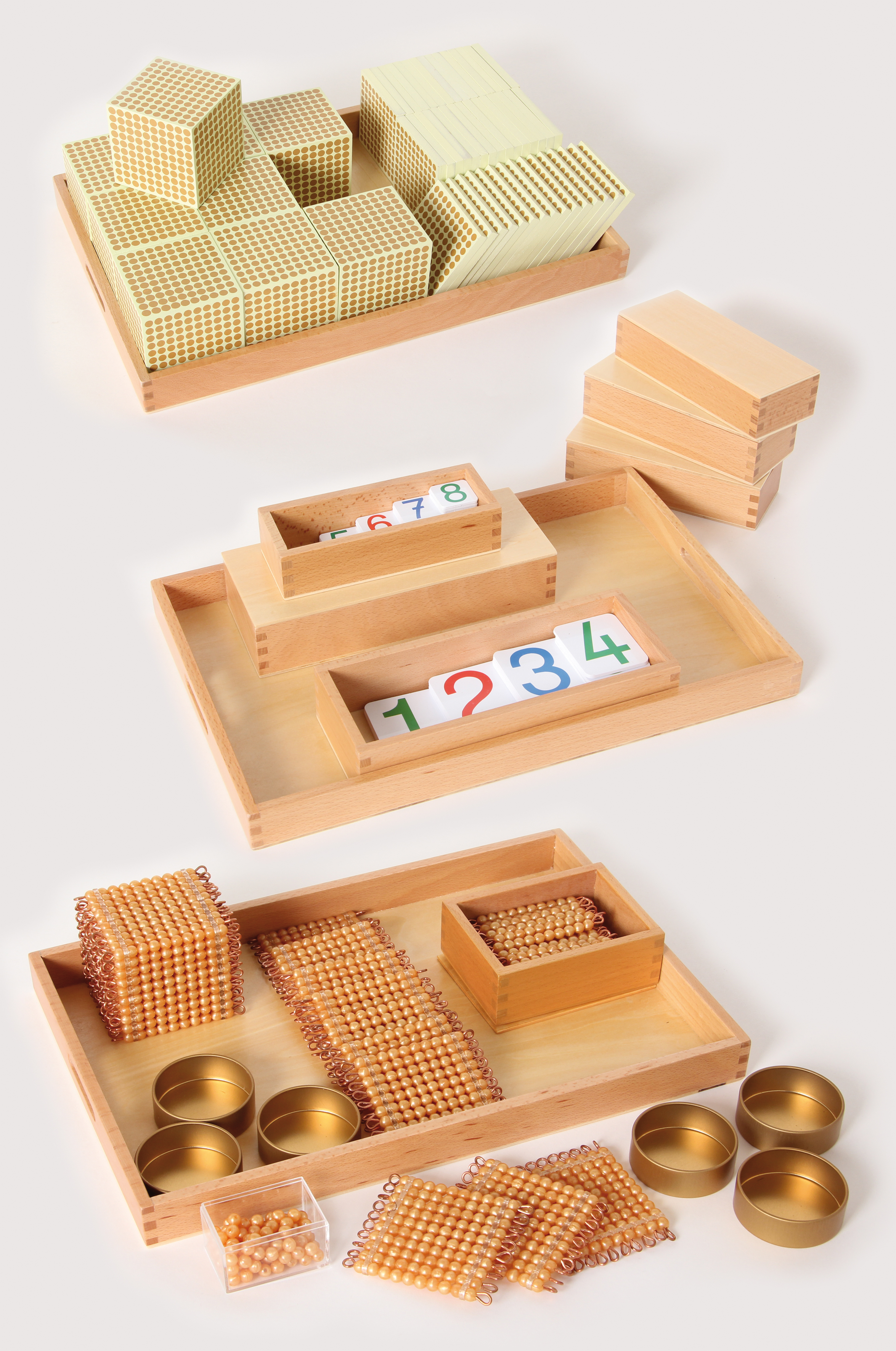 Das umfangreiche, besonders hochwertige Material besteht aus: - 1 Tausenderkubus aus Perlen (7 x 7 x 7 cm) - 9 Tausenderkuben aus Holz (7 x 7 x 7 cm) - 10 Hunderterplatten aus Perlen (7 x 7 x 0,7 cm) - 45 Hunderterplatten aus Holz (7 x 7 x 0,7 cm) - 45 Zehnerperlenstäbchen (Länge 7 cm) im goldfarbigen Holzkästchen mit Deckel (12 x 9 x 4 cm) - 100 Einzelperlen in Plastikdose (5 x 5 x 3,5 cm) - 3 Holzkästchen mit dem kleinen Kartensatz von 1 - 3000 aus Kunststoff (15 x 6 x 4 cm) - 1 Holzkästchen mit dem kleinen Kartensatz von 1 - 9000 aus Kunststoff (15 x 6 x 4 cm) - 1 Holzkasten mit dem großen Kartensatz von 1 - 1000 aus Kunststoff (22 x 9 x 4,5 cm) - 1 Holzkasten mit dem großen Kartensatz von 1 - 9000 aus Kunststoff (22 x 9 x 4,5 cm) - 6 Metallbechern (4,5 x 4,5 x 2,5 cm) - 3 Holztabletts (37,5 x 24 x 3 cm) Bei diesem besonders hochwertigen Material sind die Perlen lose auf Metallstäben aufgefädelt. Das Goldene Perlenmaterial ist das vielfältigste Montessori-Material. Damit wird der Zahlenraum bis über 9000 e