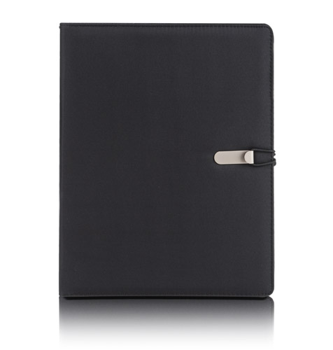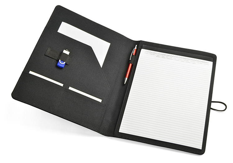 Einfache Mappe mit modernem Design. Hauptfach, viele kleine Taschen. Raum für 2 USB-Sticks, Kugelschreiber, Notizbuch. Mit Gummibandverschluss. Die Mappe aus Mikrofaser und Polyester hergesstelt. Das Logo wird auf dem Metallhaken graviert. Notizbuch ist nicht dauerhaft fixiert, sondern in die Tasche hineingeschoben, so dass es leicht ersetzt werden kann.
