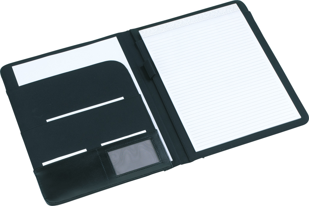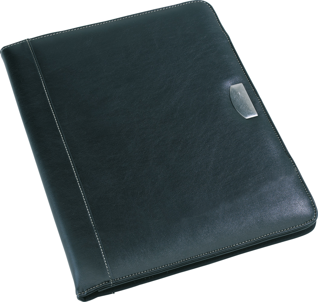 Konferenzmappe NOBLESSE im DIN-A4-Format: mit Schreibblock, Stifteschlaufe, diversen Einsteckfächern, weißen Schmuck- und Kantennähten, aus hochwertigem Kunstleder mit Metallplättchen für Ihr Logo