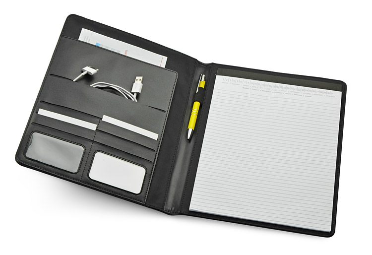Elegante, klassische Aktentasche aus lederähnlichem Material (PU). Innen 1 großes Dokumentenfach, 1 mittleres Fach und 6 kleine Fächer z. B. für Visitenkarten. Im Lieferumfang enthalten ist ein Linien-Notizbuch (20 A4-Blätter). Der Notizblock ist nicht fixiert, sondern gleitet in die Tasche, so dass er leicht ausgetauscht werden kann. Ihr Logo kann mit verschiedenen Techniken auf der Oberfläche der Mappe angebracht werden.