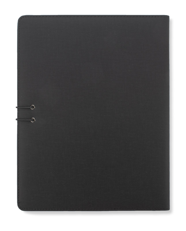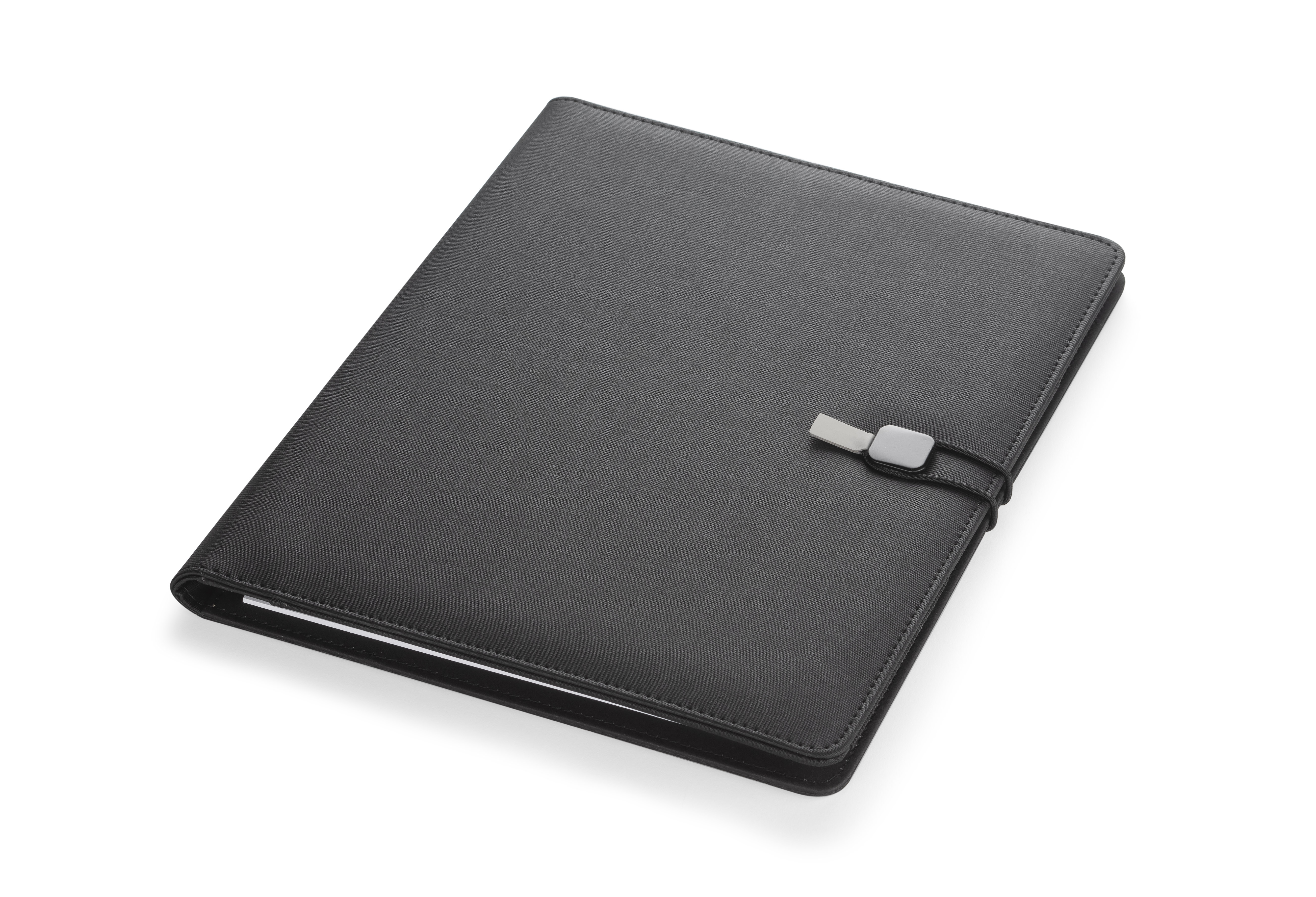 TELLA Konferenzmappe mit Gummiband, geschlossen mit einem grauen lederähnlichen Material (PU), das das Öffnen der Mappe erleichtert und gleichzeitig eine interessante und elegante Dekoration bietet. Enthält eine Dokumententasche, zwei kleinere Taschen, Platz für einen Stift und Visitenkarten sowie einen A4-Notizblock mit austauschbarem Stift.