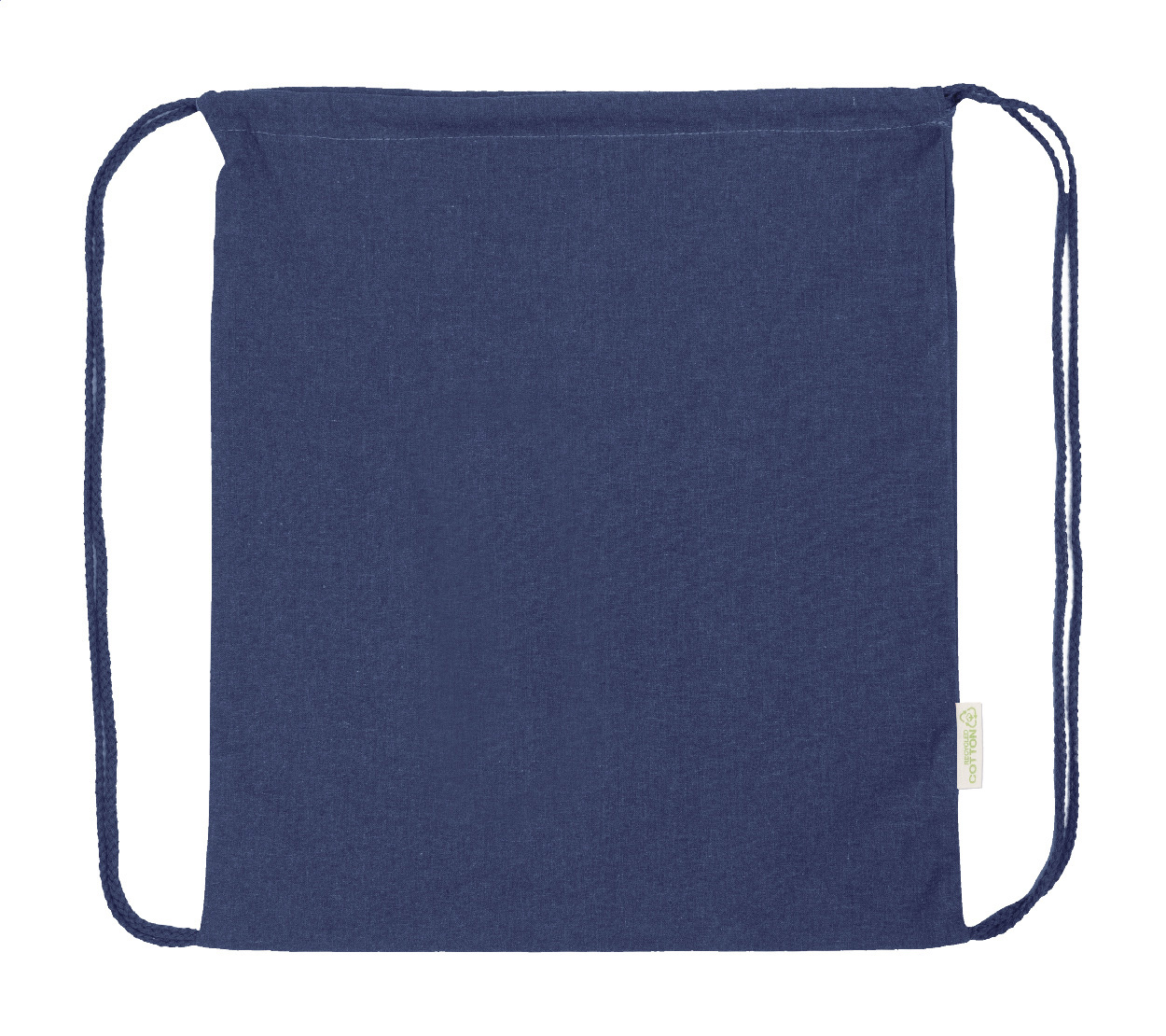 Kordelzugbeutel aus 70 % recycelter Baumwolle und 30 % RPET-Polyester, 140 g / m². Mit Label recycelte Baumwolle.