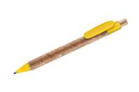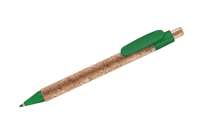 Hochwertiger Kork-Kugelschreiber mit blau schreibender Großraummine. Die Werbung wird rechts vom Clip angebracht.
