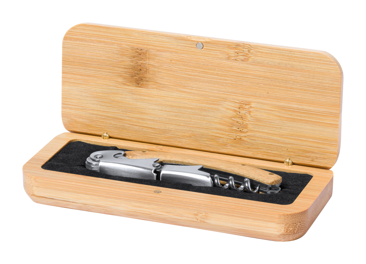 Korkenzieher mit Flaschenöffner aus Edelstahl mit Bambusgriff. Verpackt in Bambusbox.