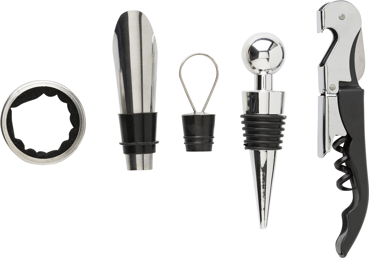 Korkweinset mit 4 Zubehörteilen. Inklusive Kellnermesser, Flaschenverschluss, Tropffänger und Einfüllstutzen. Einzeln verpackt in einer braunen Kartonbox.