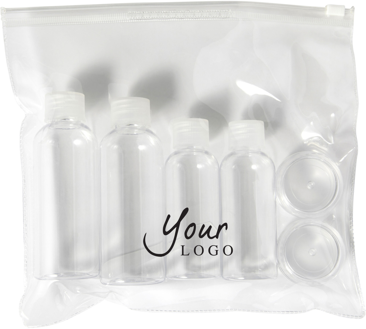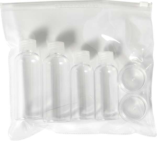 Kosmetik-Reiseset aus PET, bestehend aus 2 Flaschen à 100 ml, 2 Flaschen à 50 ml, 2 Dosen à 10 ml und einem Spatel im verschließbarem Zip-Beutel. Die Flaschen / Dosen werden ohne Inhalt geliefert.