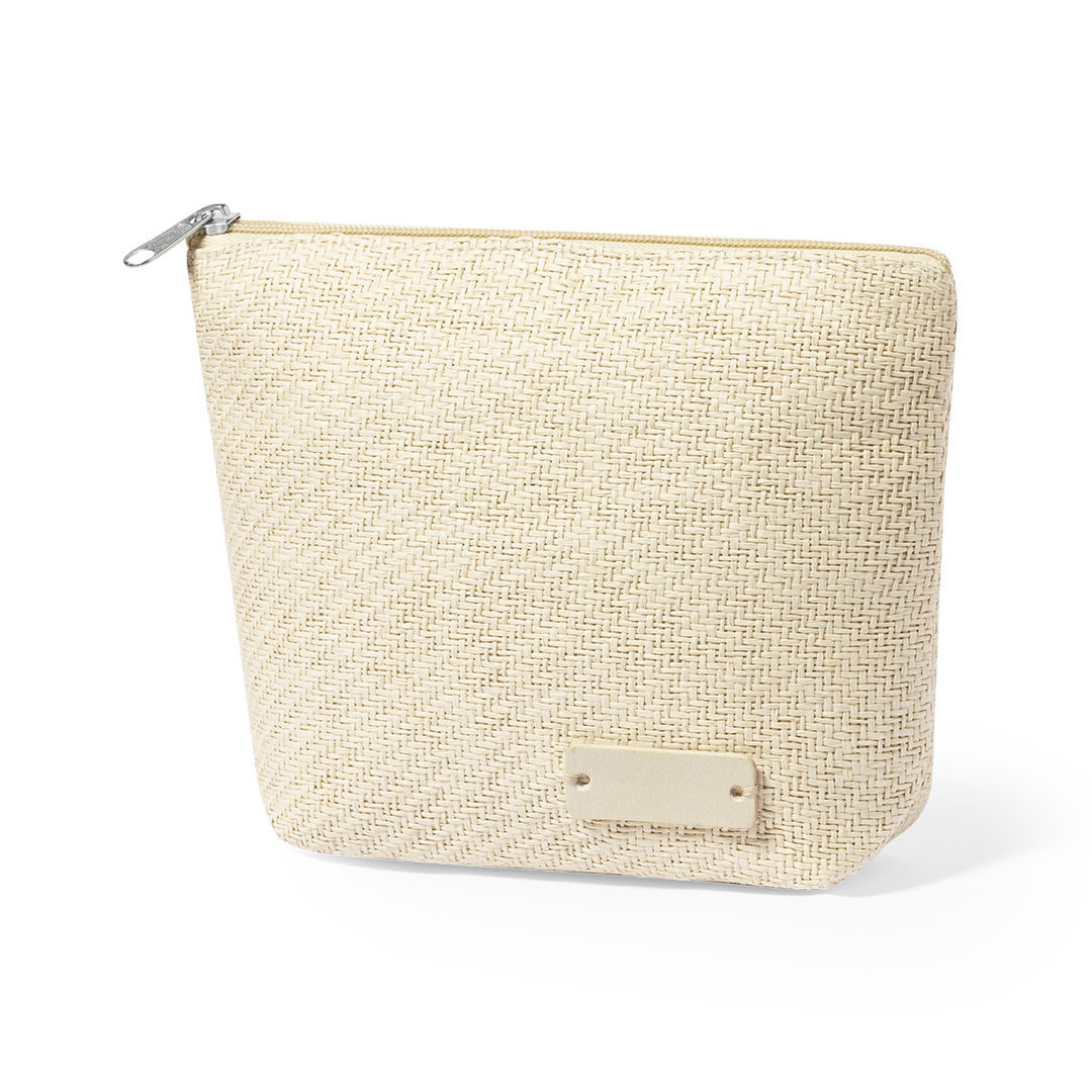 Kosmetiktasche aus synthetischem Material mit Reißverschluss und Metallgriff. Mit Oberfläche zur Personalisierung auf Holz, speziell für die Lasergravur entwickelt.