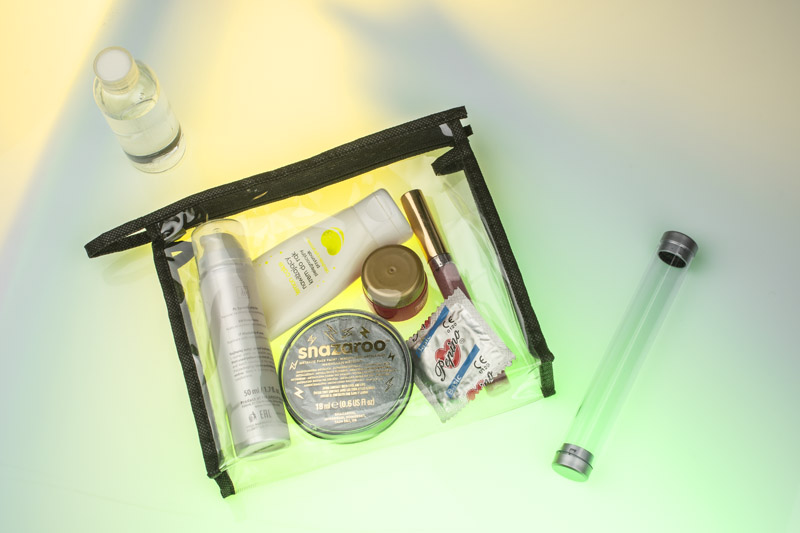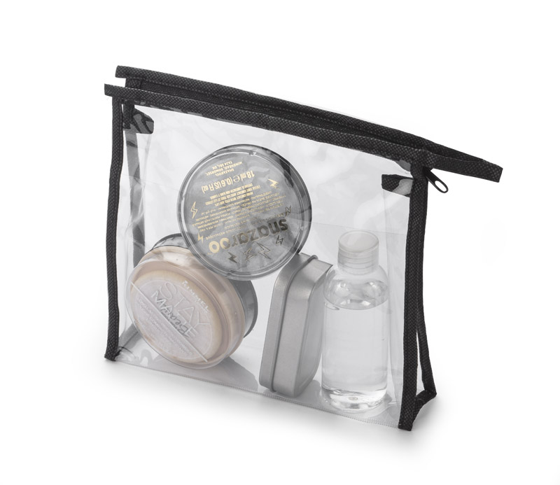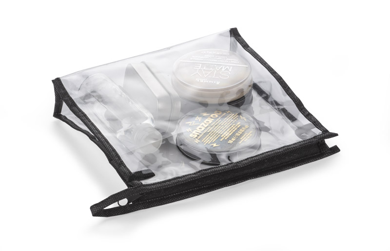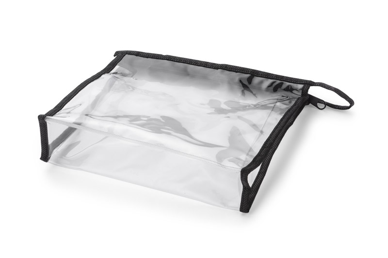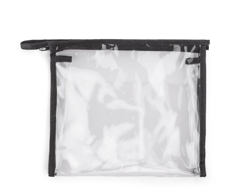 Transparente Kosmetiktasche mit Reißverschluss, aus PVC und nicht-gewebtes Polypropylen hergestellt. Perfekt als Handtasche für Flüssigkeiten für Handgepäck geeignet.