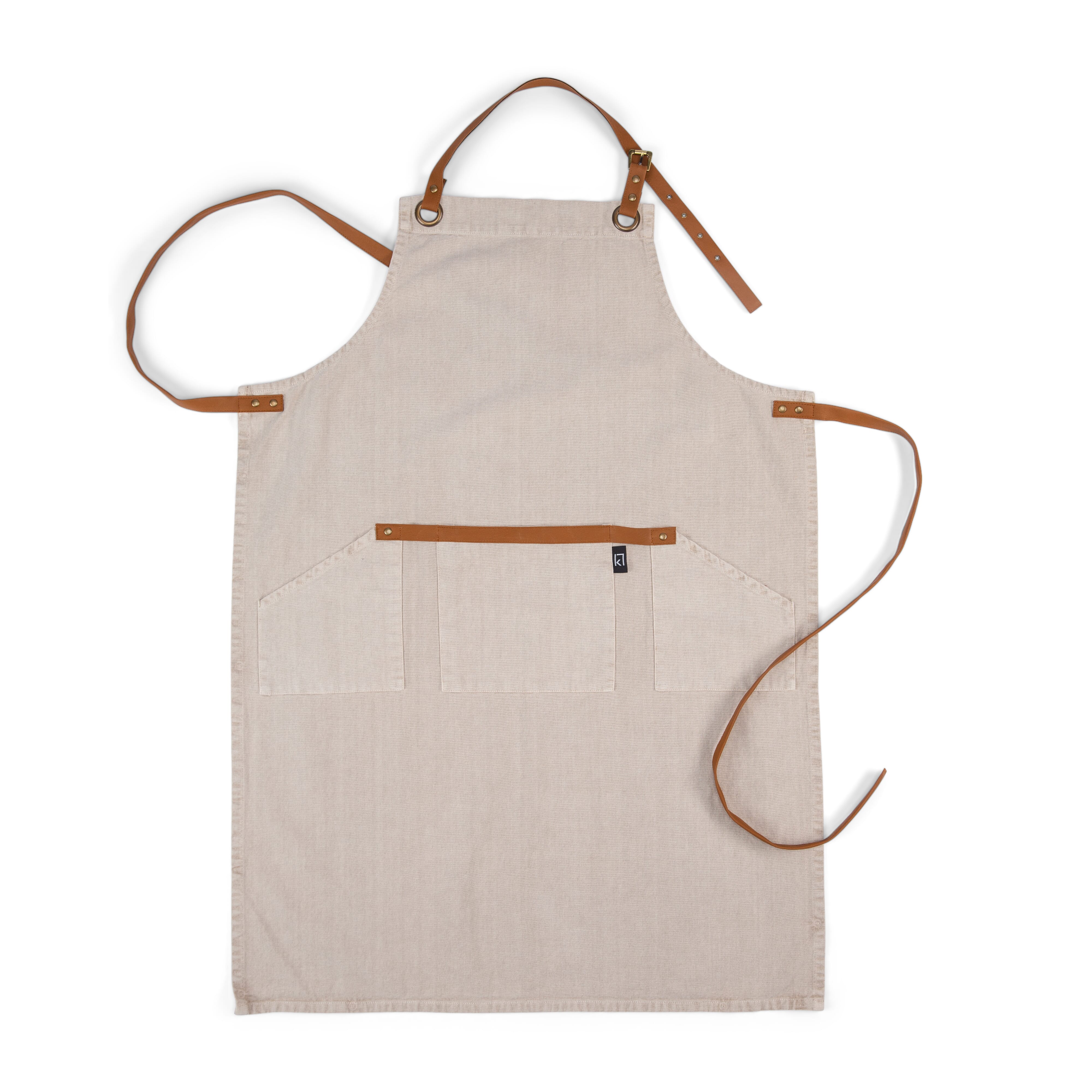 Schürze aus reiner Baumwolle mit verstellbarem Band im Nacken und drei Taschen in der Taille. Riemen und Details aus PU-Leder.