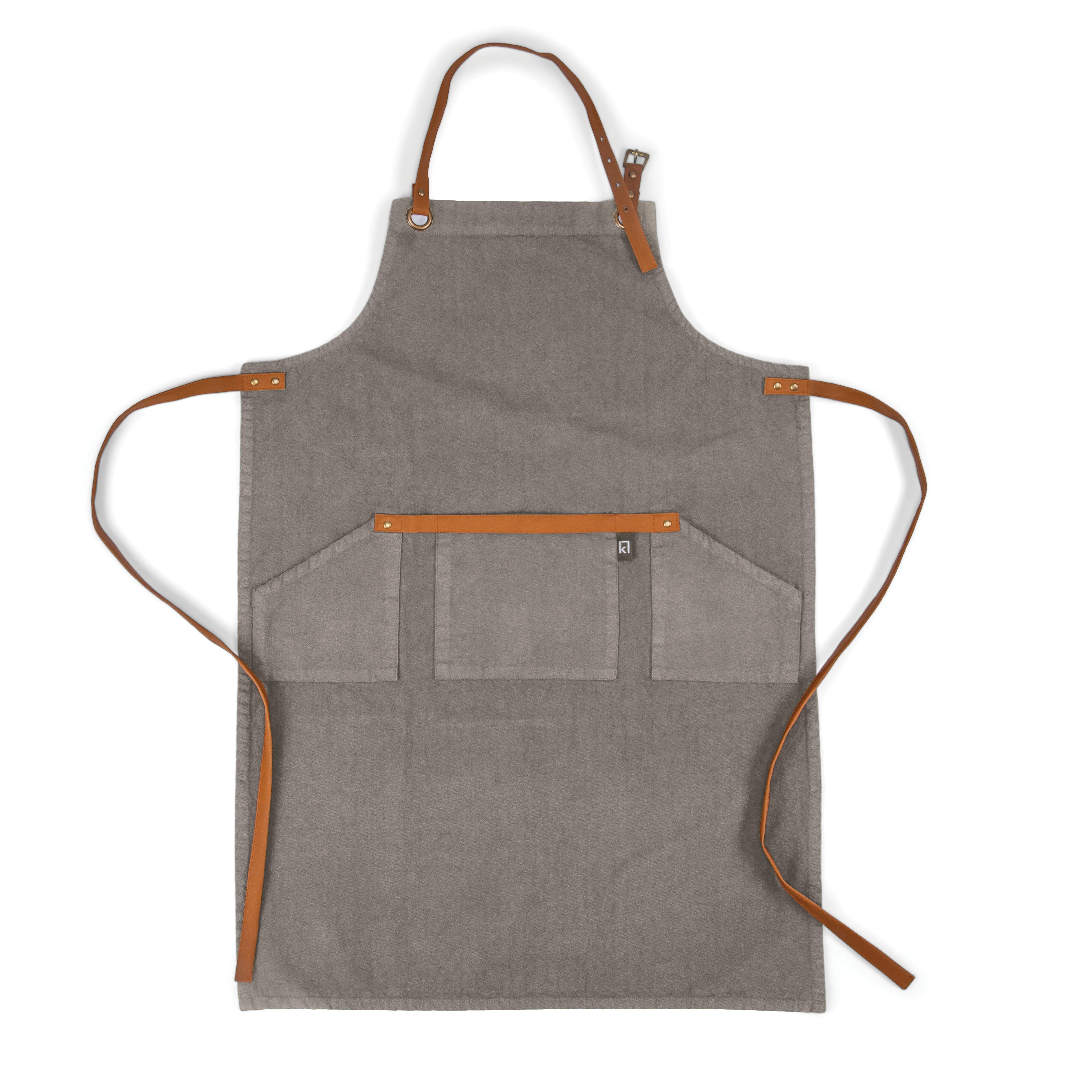 Schürze aus reiner Baumwolle mit verstellbarem Band im Nacken und drei Taschen in der Taille. Riemen und Details aus PU-Leder.