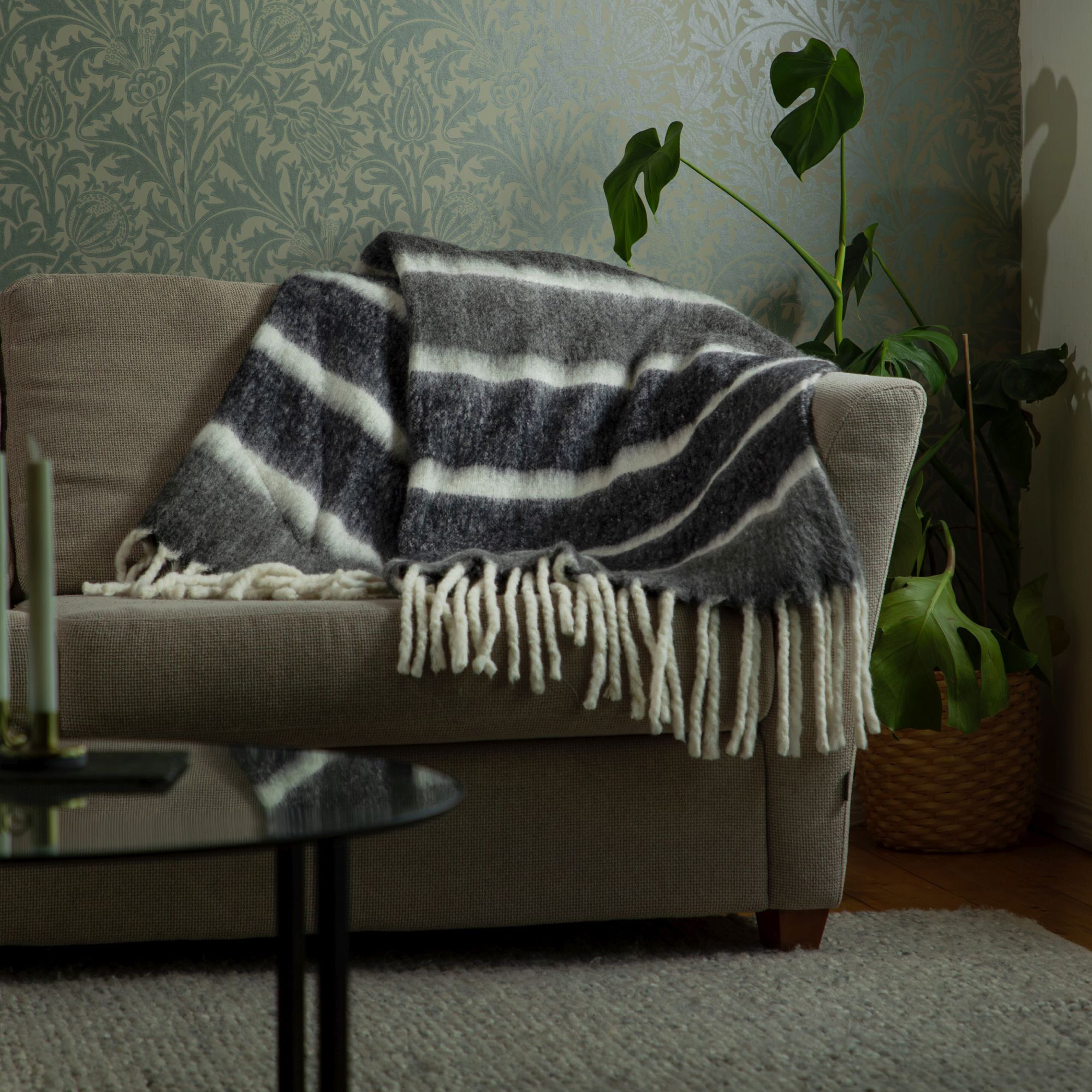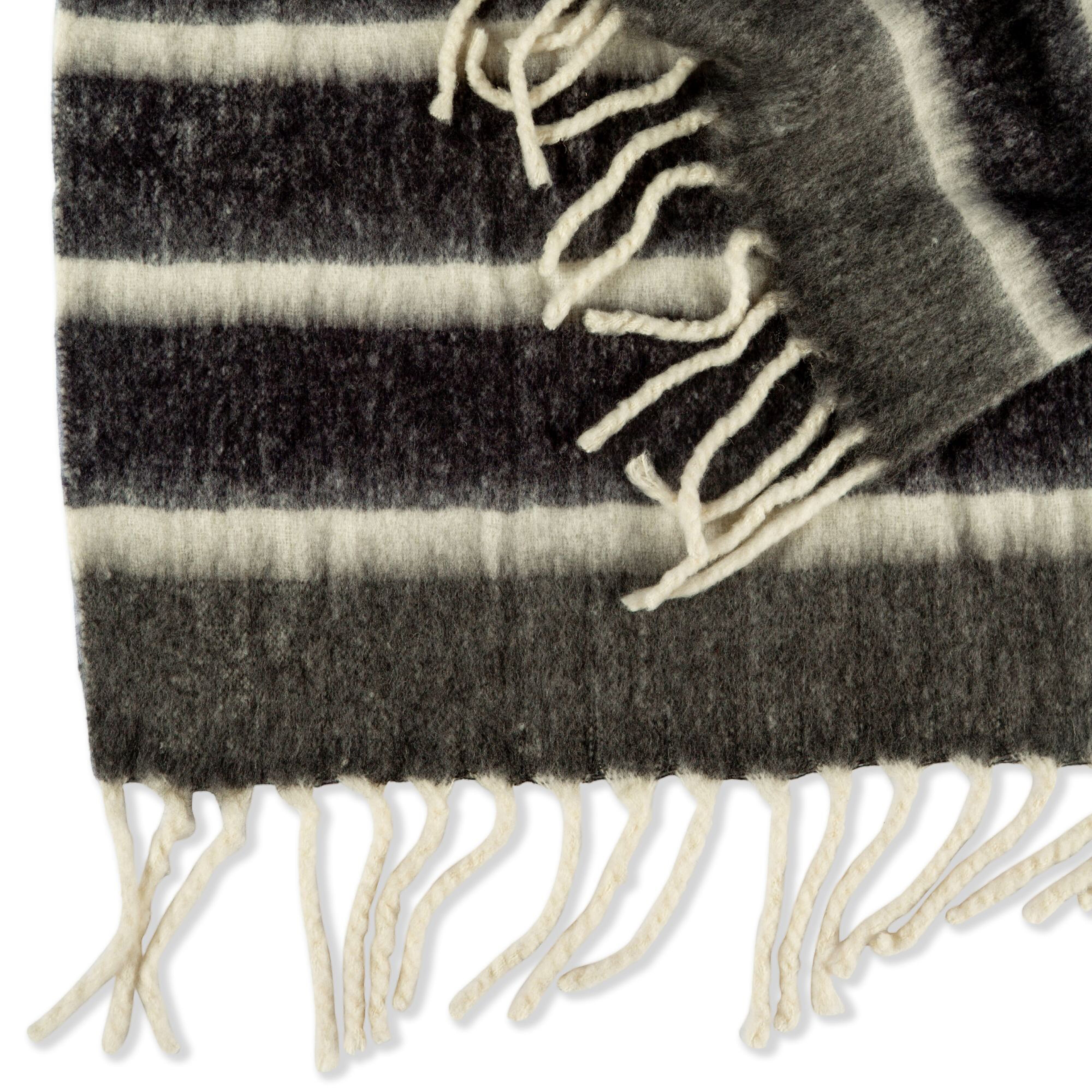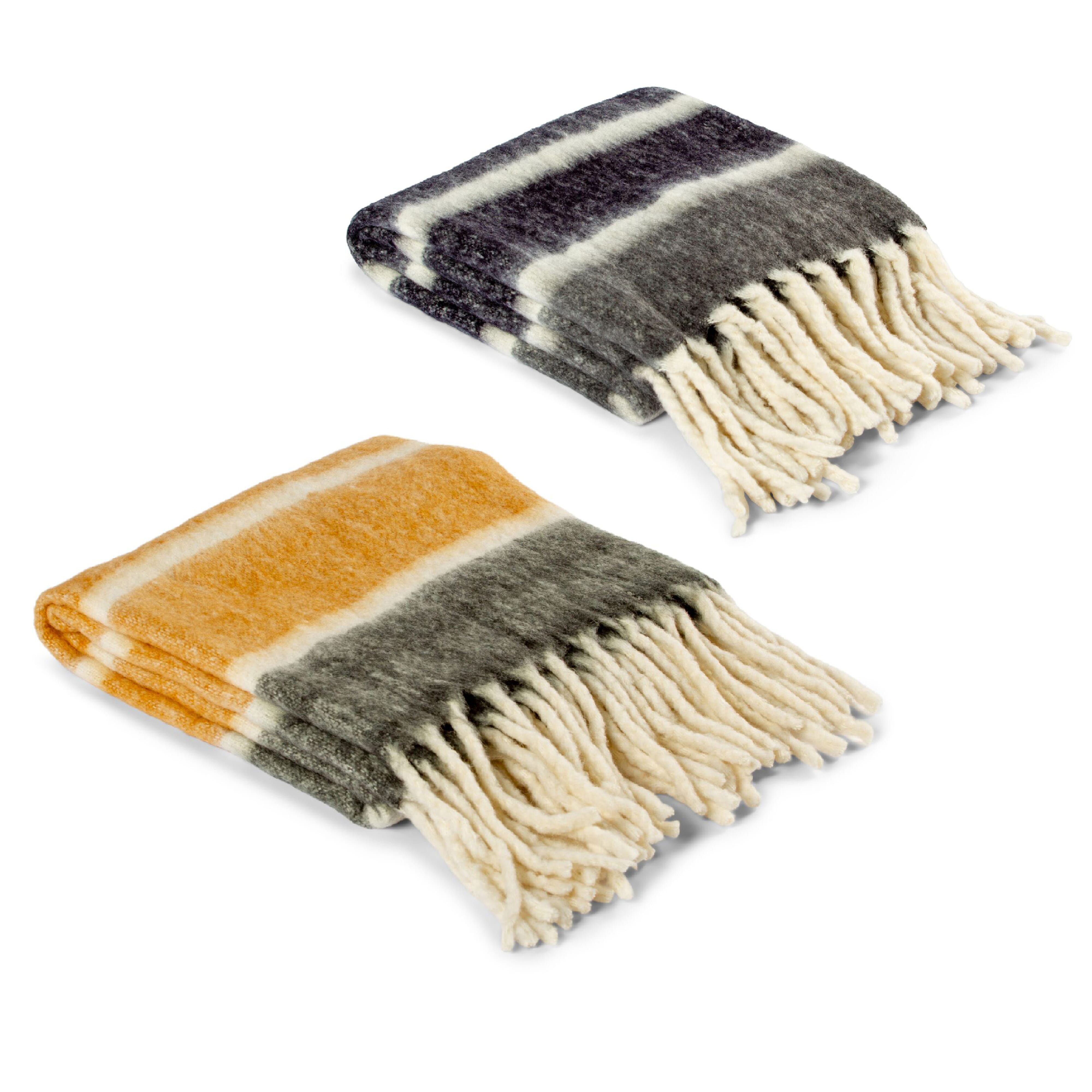 Dieses gestreifte, handgewebte Plaid ist sowohl gemütlich als auch stilvoll! Es ist aus hochwertiger Wolle und Acryl gefertigt und verleiht mit seinen großen, dicken Fransen einen zusätzlichen Hauch von Eleganz. Perfekt für einen kalten Winterabend.