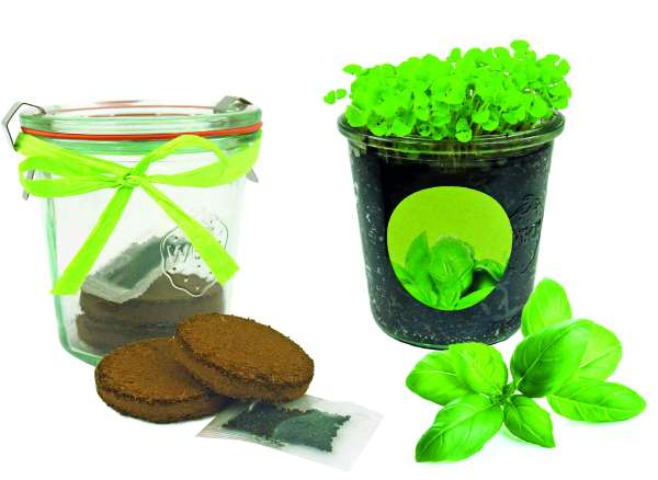 Weckglas (290 ml) mit Erdtabletten, Pflanzanleitung und Samen Basilikum