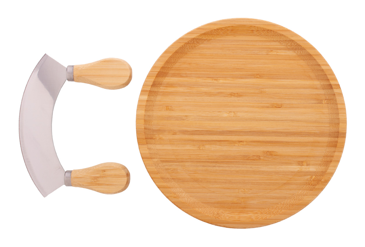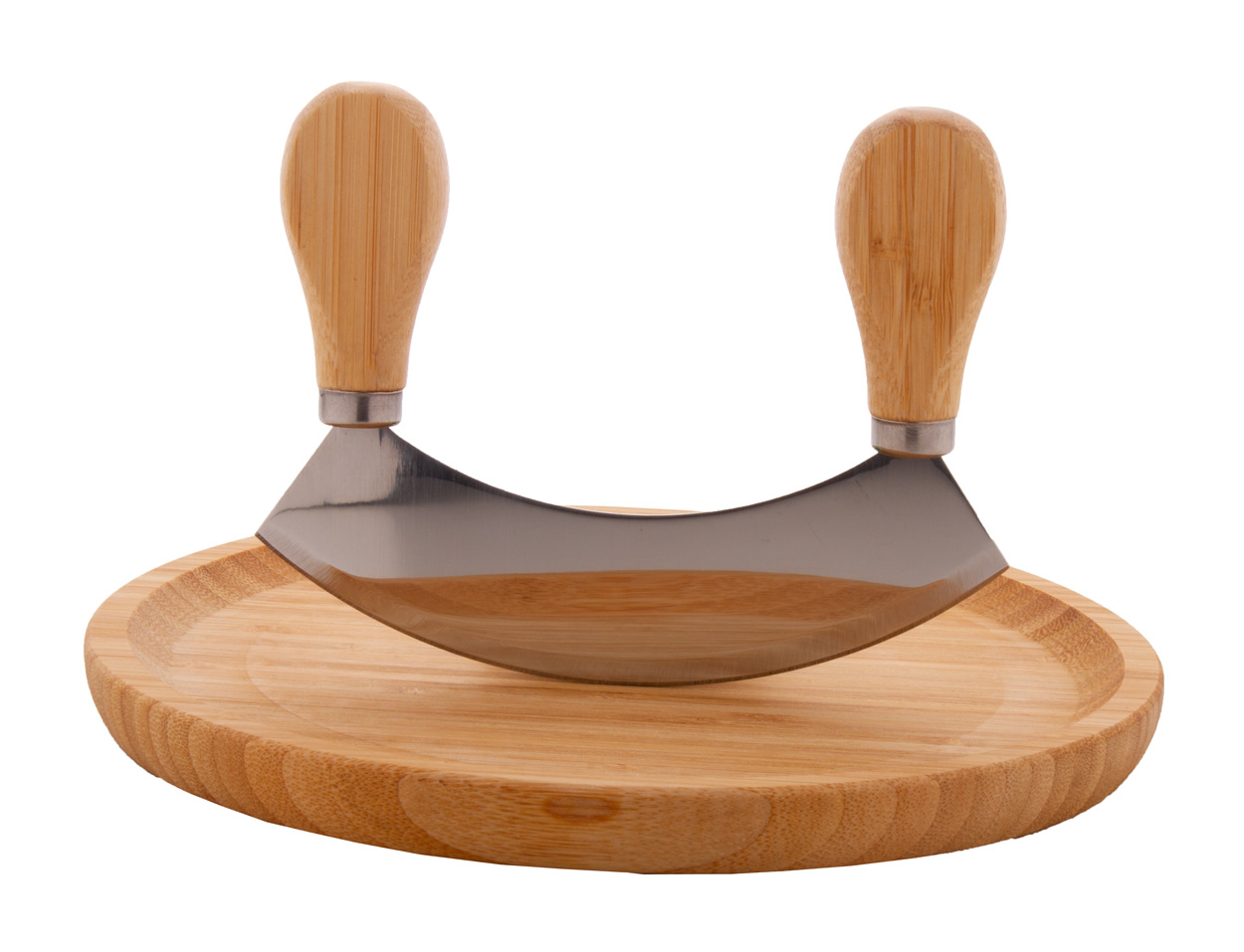 Kräuter-Schneideset aus Bambus, bestehend aus rundem Schneidebrett aus Bambus und Kräutermesser aus Edelstahl mit Bambusgriffen.