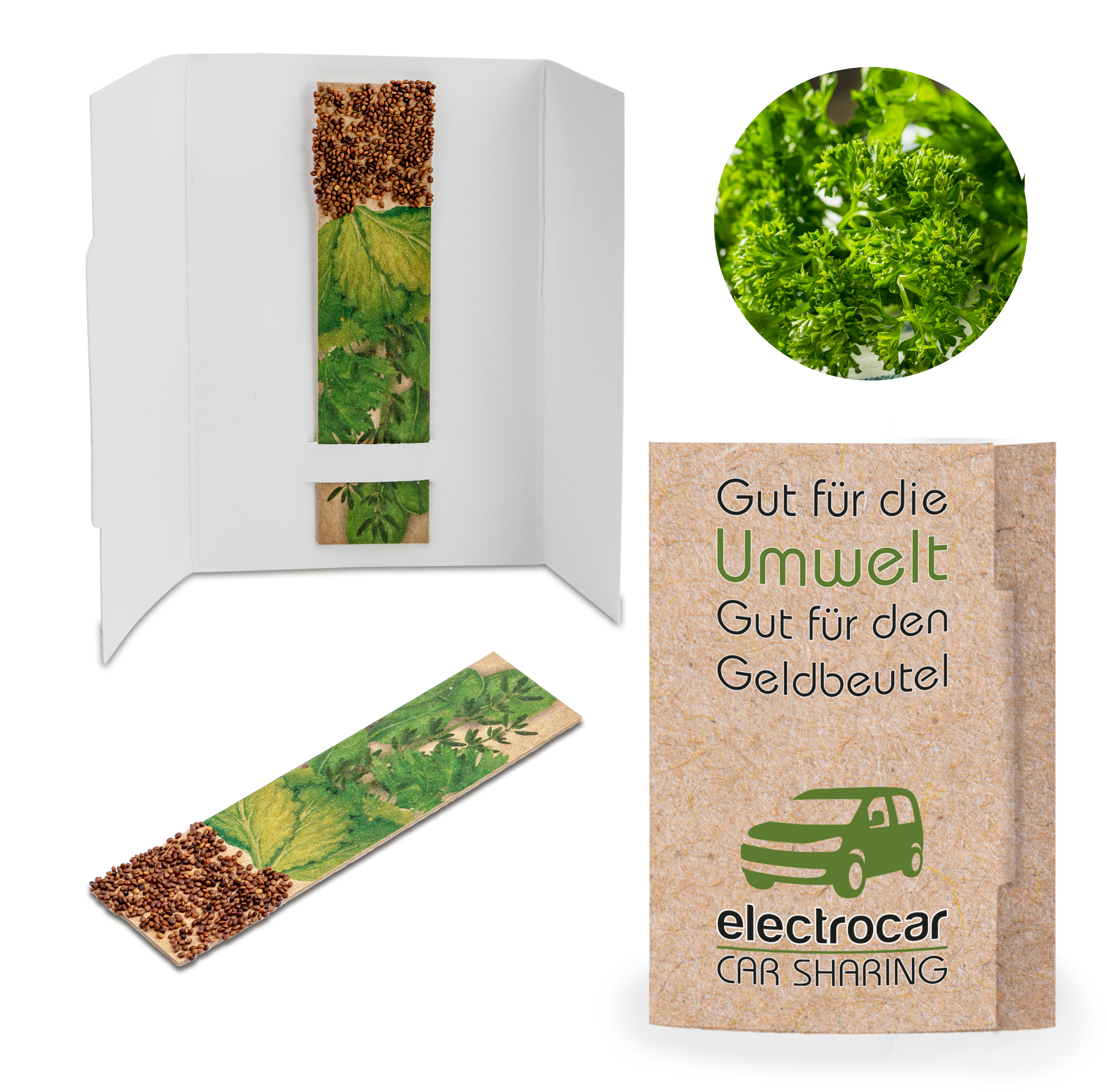 Frische Kräuter verfeinern jedes Essen und betören mit ihrem Duft. Am besten schmecken sie natürlich, wenn man sie selbst gezüchtet hat. Mit dem Kräuter-Stick geht das jetzt auf jeder Fensterbank, dem Bürotisch oder im Freien ganz einfach. Auf dem Pappstreifen aus Kraftpapier, bedruckt mit einem Bild leckerer Kräuter, werden mit Wachs Samen angebracht. Steckt man diesen nun in Erde und gießt fleißig, keimen leckere Gartenkräuter daraus. Die Verpackung in flacher Kartenform kann rundum gestaltet und bedruckt werden und ist durch die flache Form ein ideales Printmailing-Produkt. Lieferbar mit den Sorten Gartenkresse, Basilikum, Thymian, Majoran, Schnittlauch, Schnittsalat oder Petersilie. Also schnell ran an die veganen Superfoods.