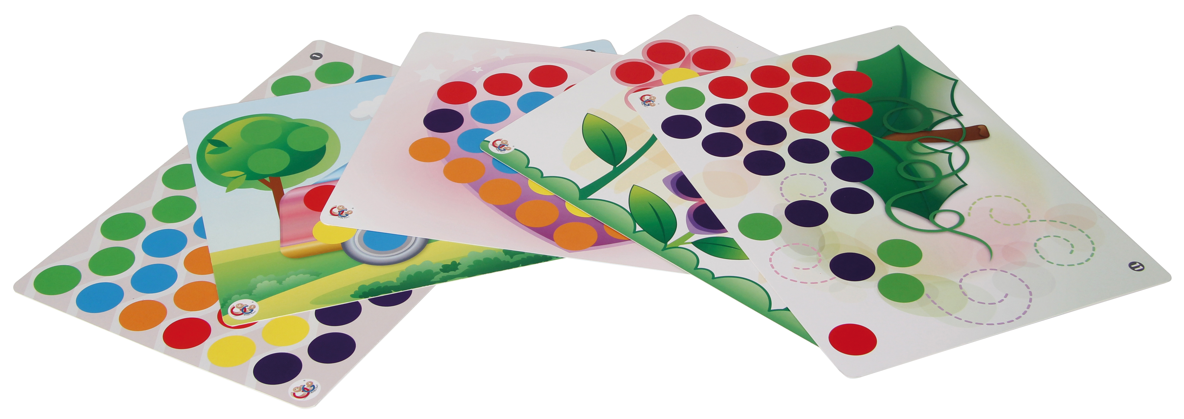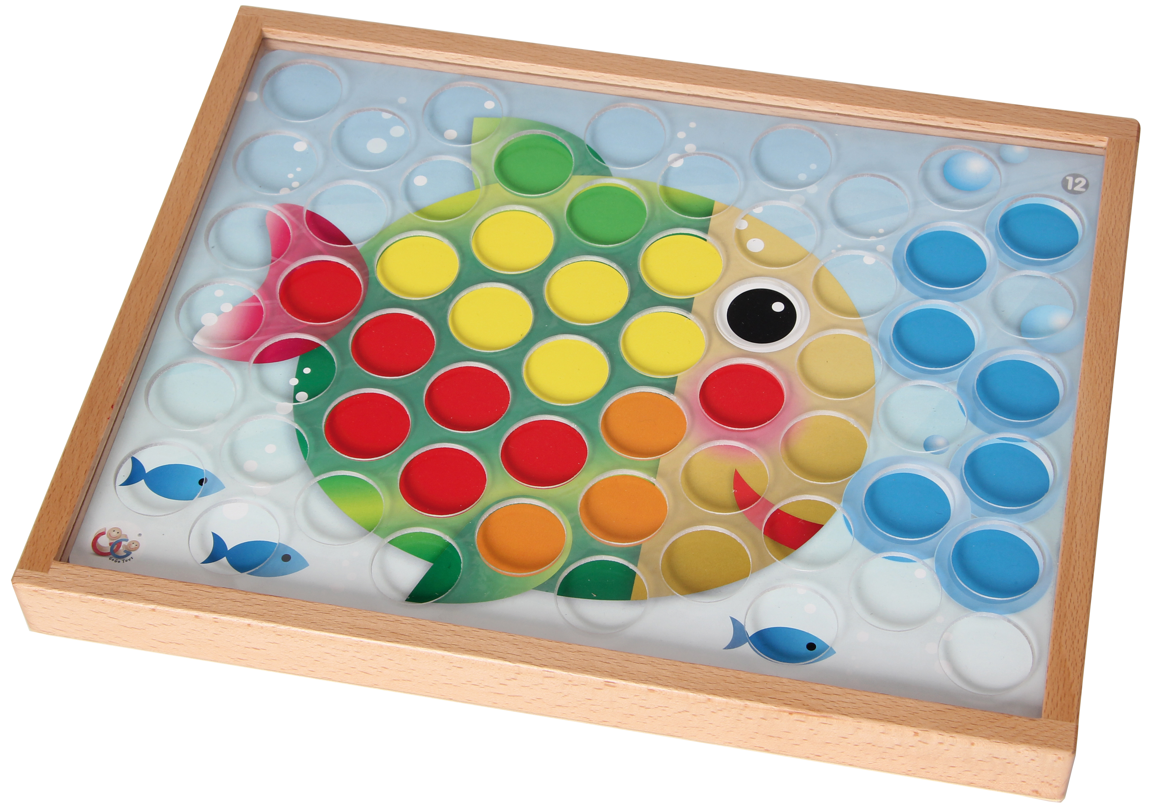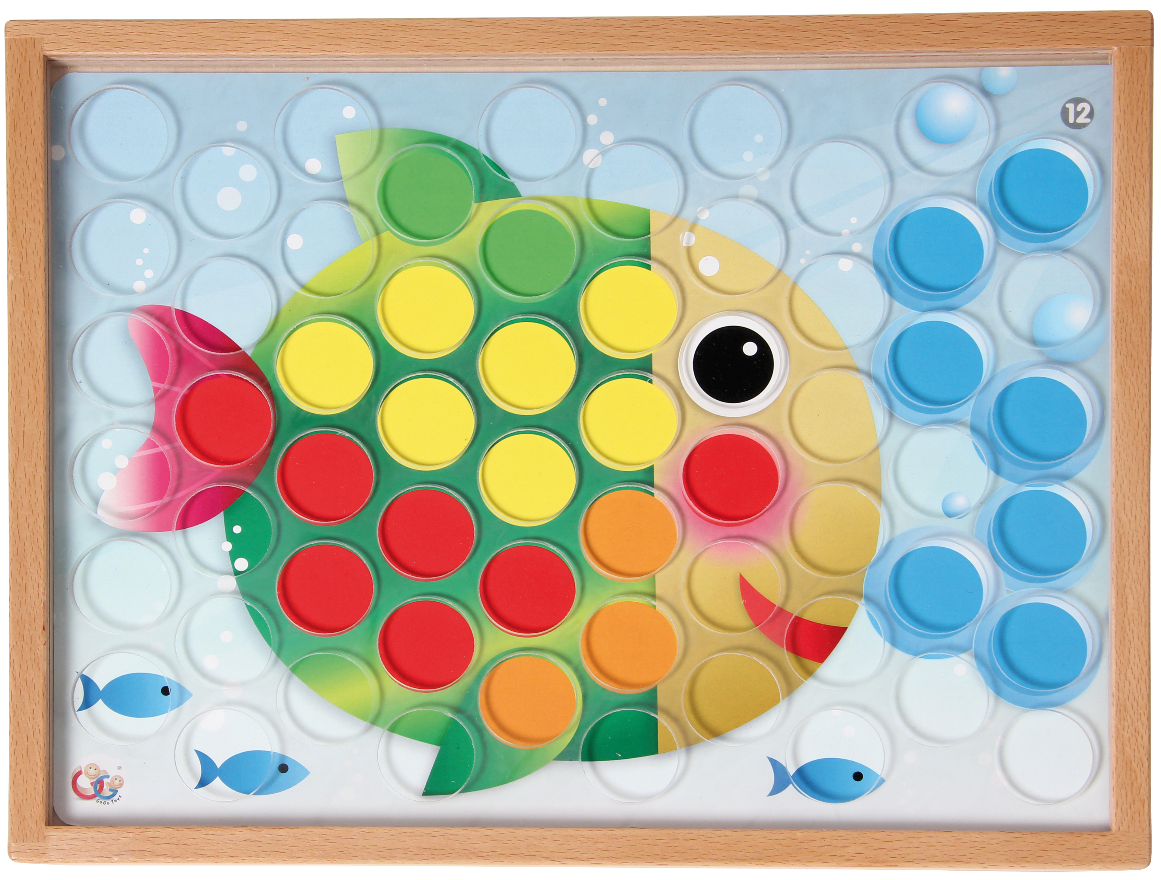Das Spiel beinhaltet 6 doppelseitige Vorlagekarten und 60 farbenfrohe Holzknöpfe in einer leicht zu greifenden Größe. Eine Vorlagenkarte einlegen und die passenden farbigen Knöpfe über das ganze Bild einlegen. Mit der durchsichtigen Lochplatte können auch Kinder ihre eigenen einzigartigen Vorlagen anfertigen! Inklusive Baumwollbeutel. Fördert die Hand-Auge-Koordination, die Feinmotorik sowie die Mustererkennung.