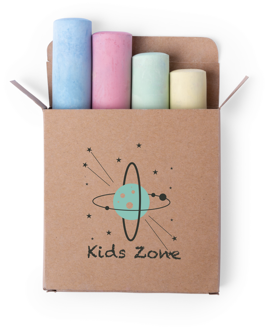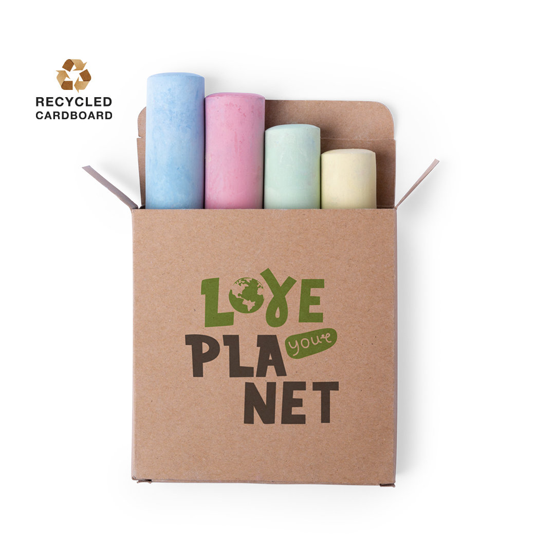 Box aus recyceltem Karton mit Kreide im XL-Format. Mit 4 Kreiden in Blau, Rot, Grün und Gelb.