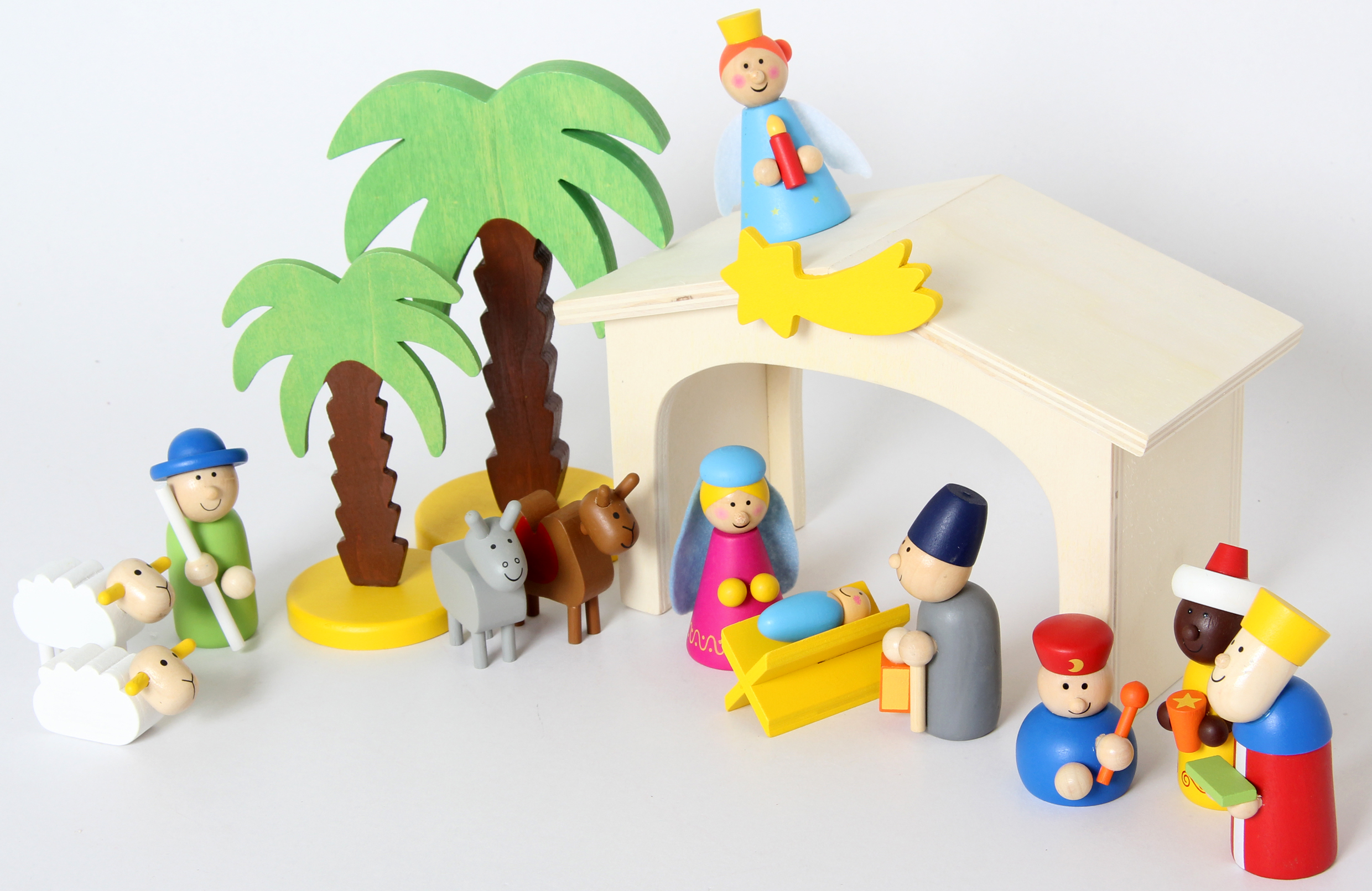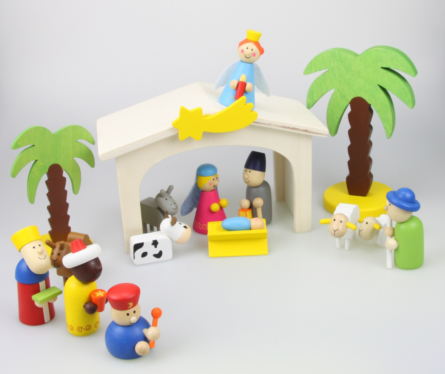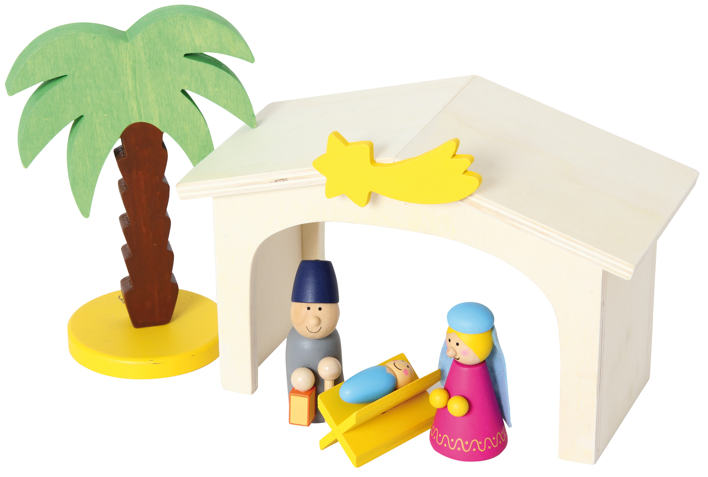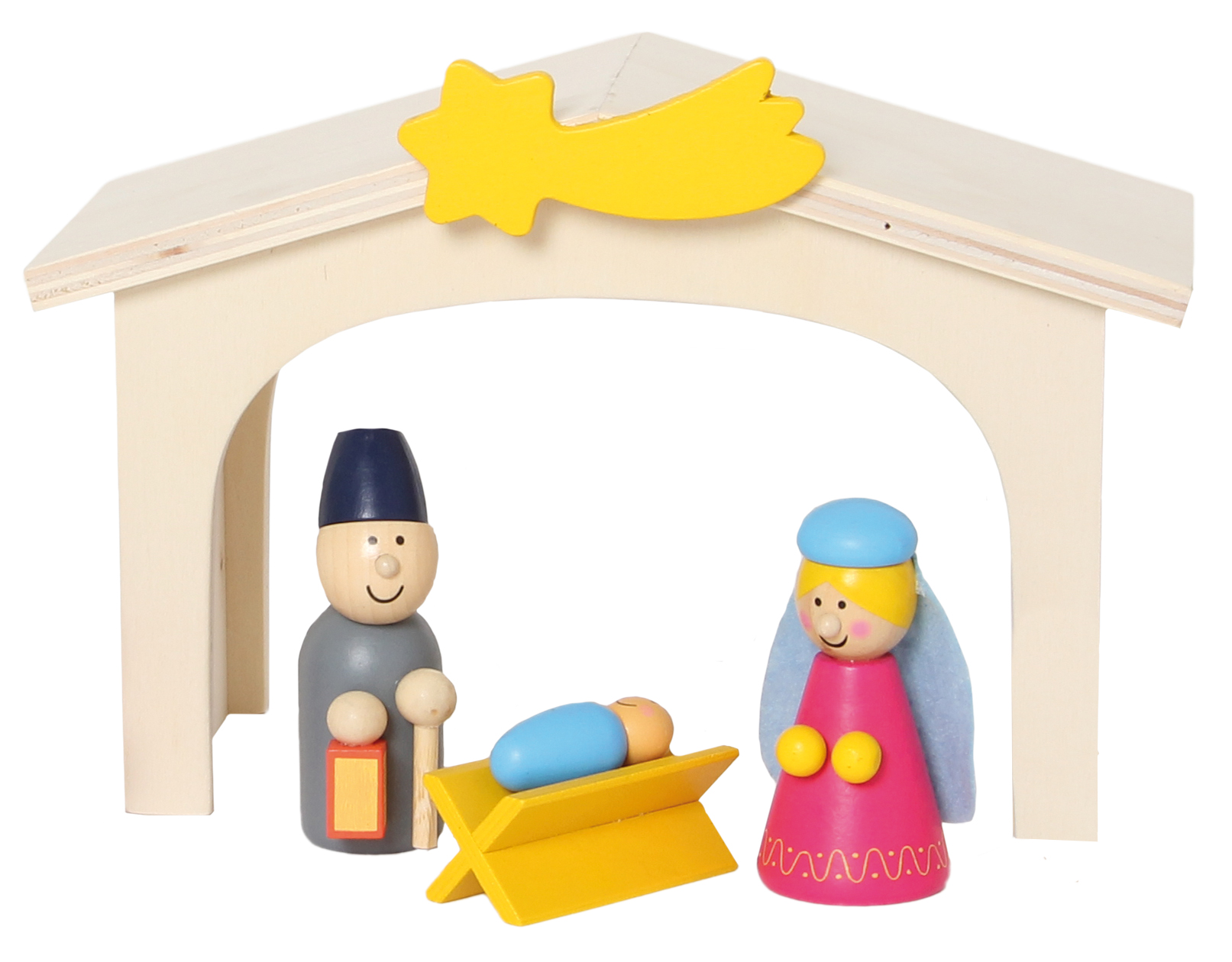 Originelles Krippenset aus Holz in kindgerechtem Design. Zum Spielen und Dekorieren. Größe des Stalles: 23 x 11,5 x 16 cm. Höhe einer Figur (Josef): 9 cm.