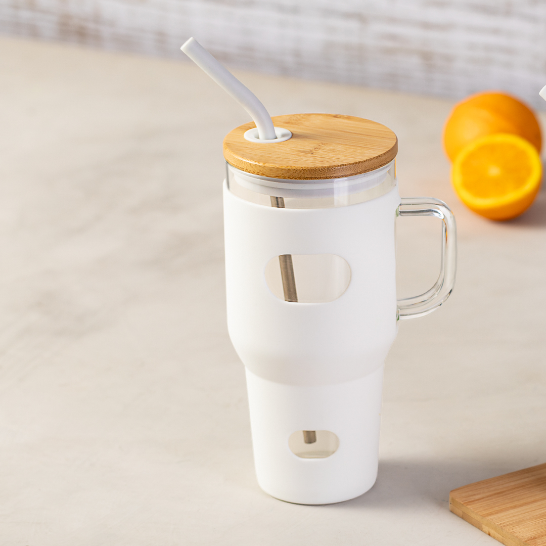 Großes Fassungsvermögen (1,1 l) mit einem Korpus aus widerstandsfähigem Glas, das eine außergewöhnliche Widerstandsfähigkeit und Langlebigkeit bietet, wodurch die Lebensdauer verlängert wird und das Gefäß unzählige Male wiederverwendet werden kann. Mit Griff zum einfachen Tragen und weicher Silikonschutzhülle. Schnappdeckel aus Bambus mit Strohhalmloch und wiederverwendbarer Strohhalm aus rostfreiem Stahl mit silikonbeschichteter Spitze für bequemen und sicheren Trinkgenuss. Präsentiert in einer individuellen Kraft-Design-Box.