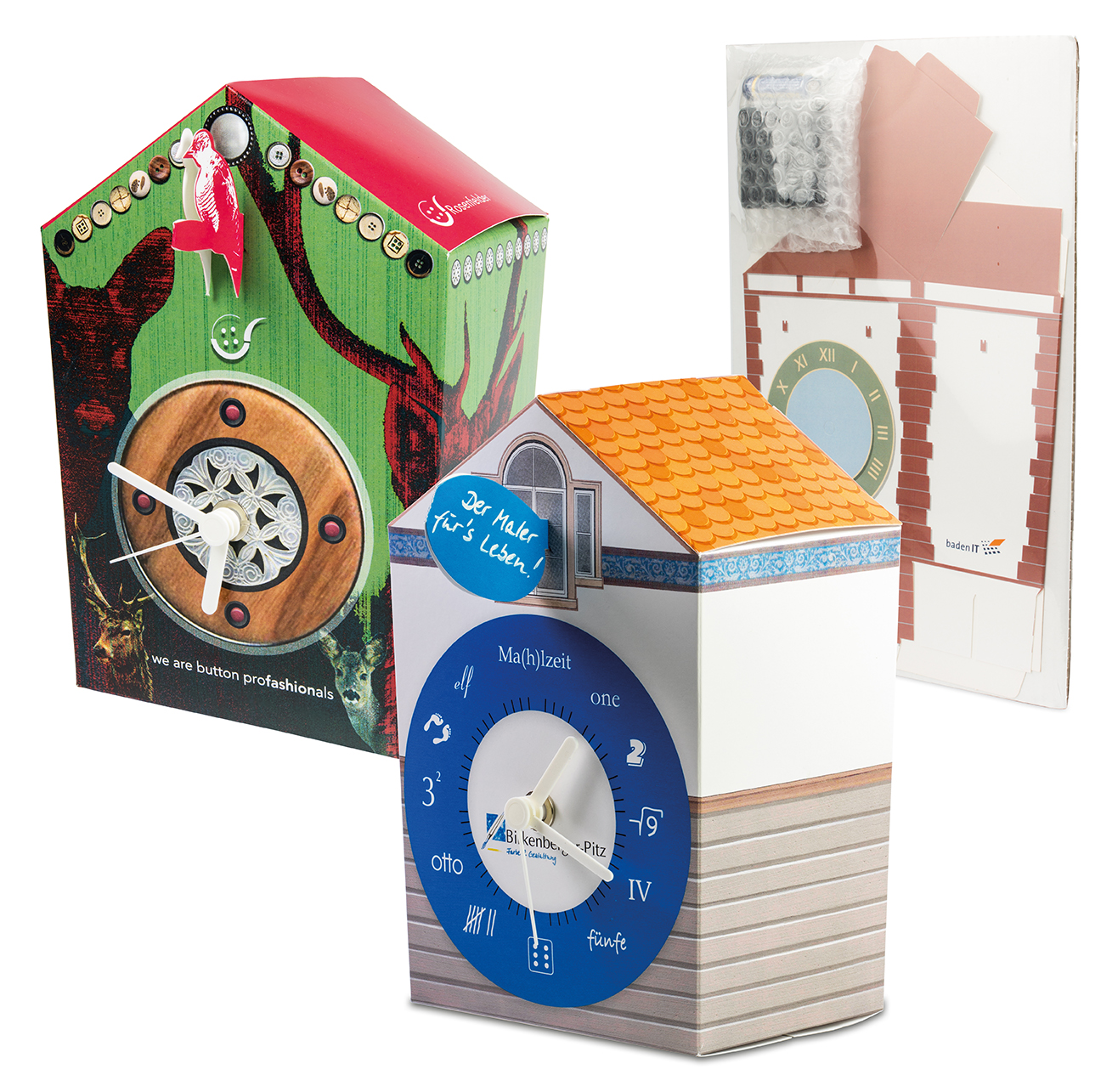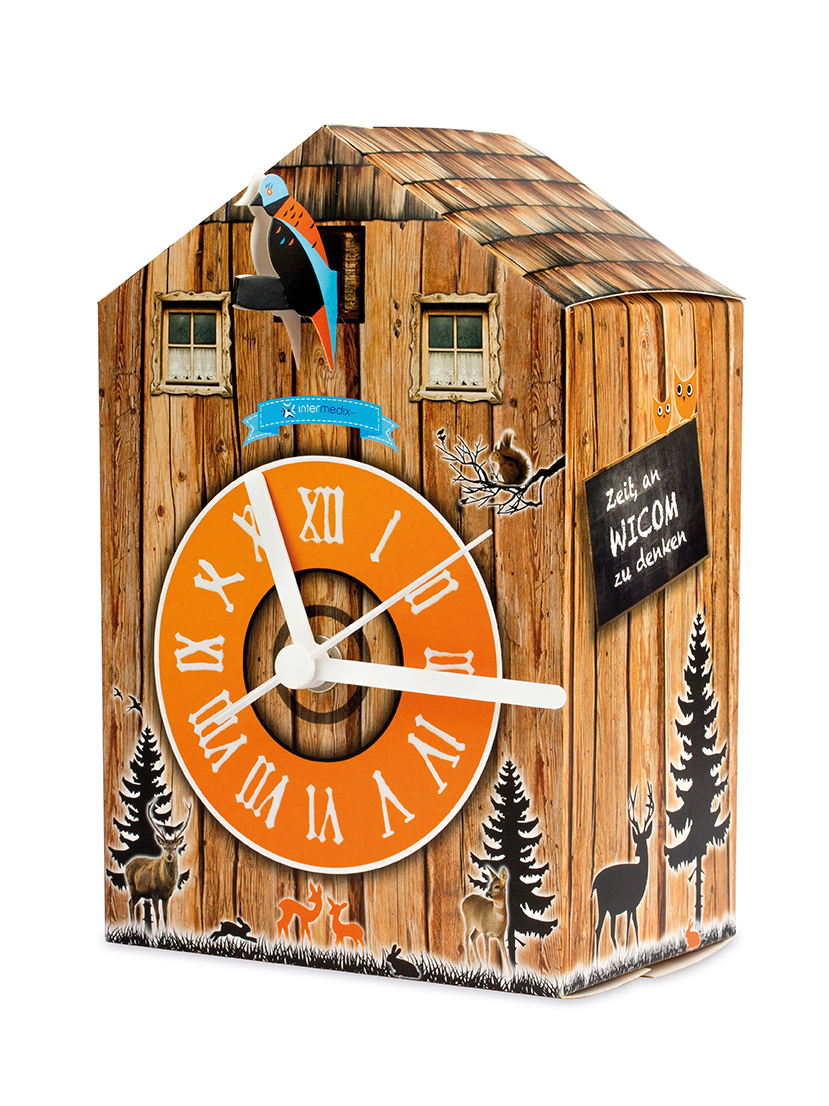 Zeit für erfolgreiche Werbekontakte: Die traditionelle Kuckucksuhr wird zum trendigen Werbeträger und begehrten Bastelobjekt. Vollflächig 4-c bedruckbar und als Set inkl. Uhrwerk, Batterie und aufsteckbarem Kuckuck und / oder Sprechblase geliefert, schmückt die Uhr dauerhaft und begeistert.