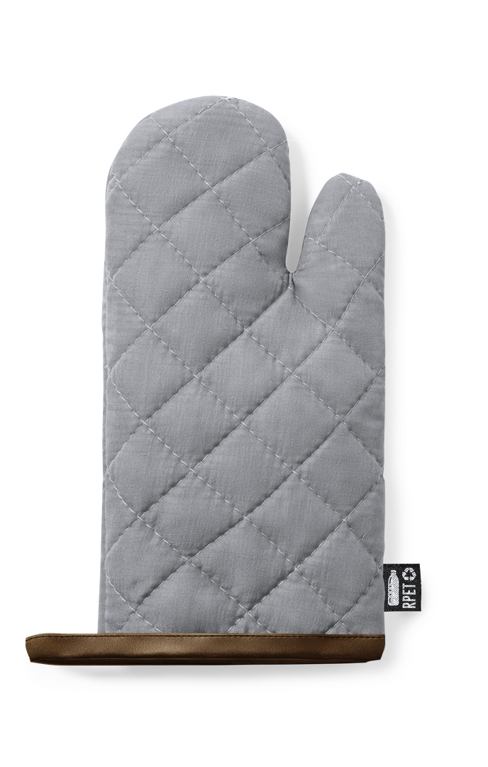 Linie Natur Küchenhandschuh. Hergestellt aus RPET-Polyester, das aus recyceltem Kunststoff hergestellt wird, um die Wiederverwendung von Kunststoffabfällen zu fördern und die Nachhaltigkeit unseres Planeten zu unterstützen. Mit einer glatten Seite zum Bedrucken und einem kontrastierenden Band zum Aufhängen. Äußeres Etikett mit RPET-Plakette.