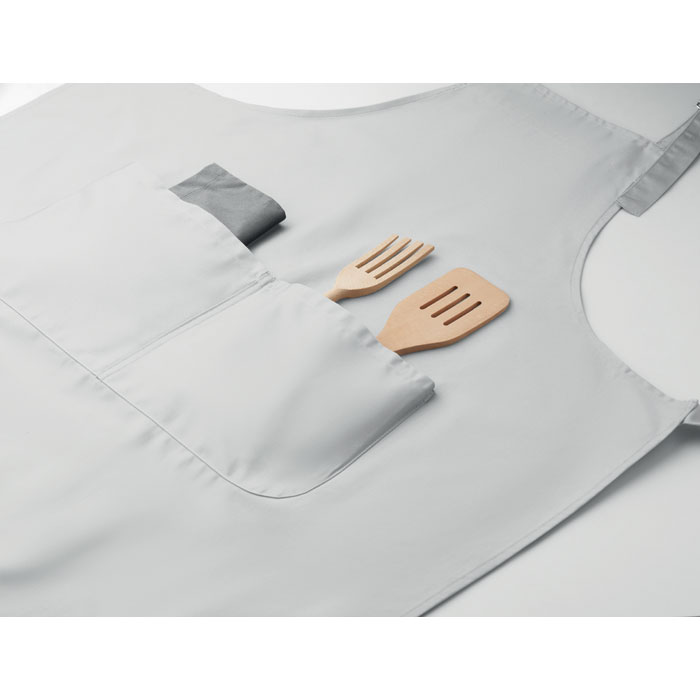 Lange, verstellbare Küchenschürze aus 240 g / m² Polycotton (35% Baumwolle, 65% Polyester) mit zwei Fronttaschen und verstellbarem Gurt mit Metallschnalle.