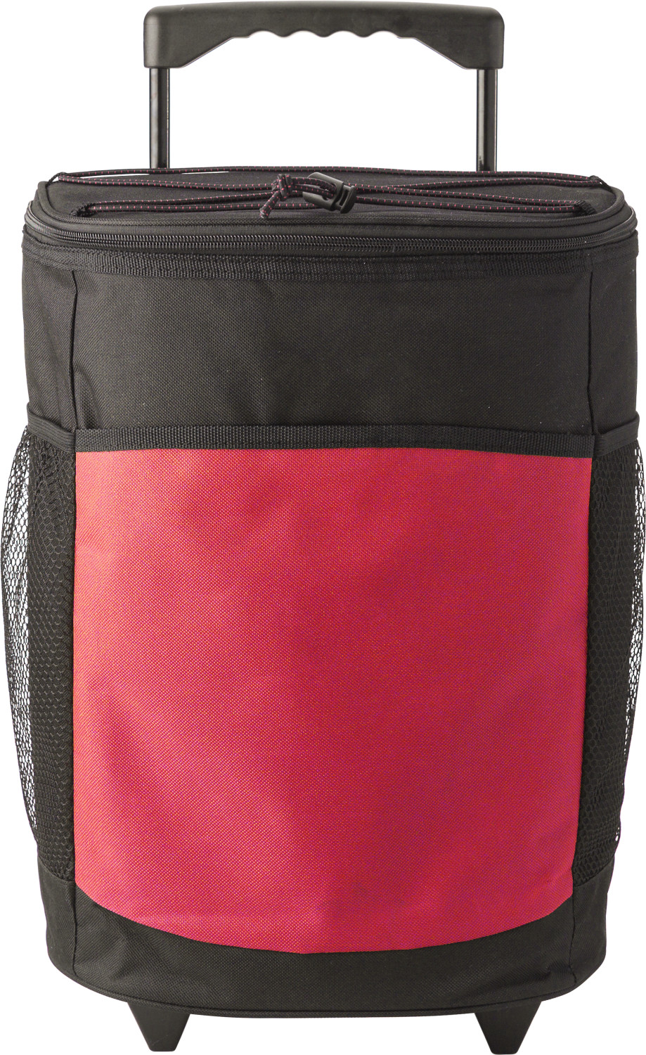 Kühl-Trolley mit ausziehbarem Griff und zwei Rädern. Mit großem Hauptfach und zusätzlichen Taschen an den Seiten.