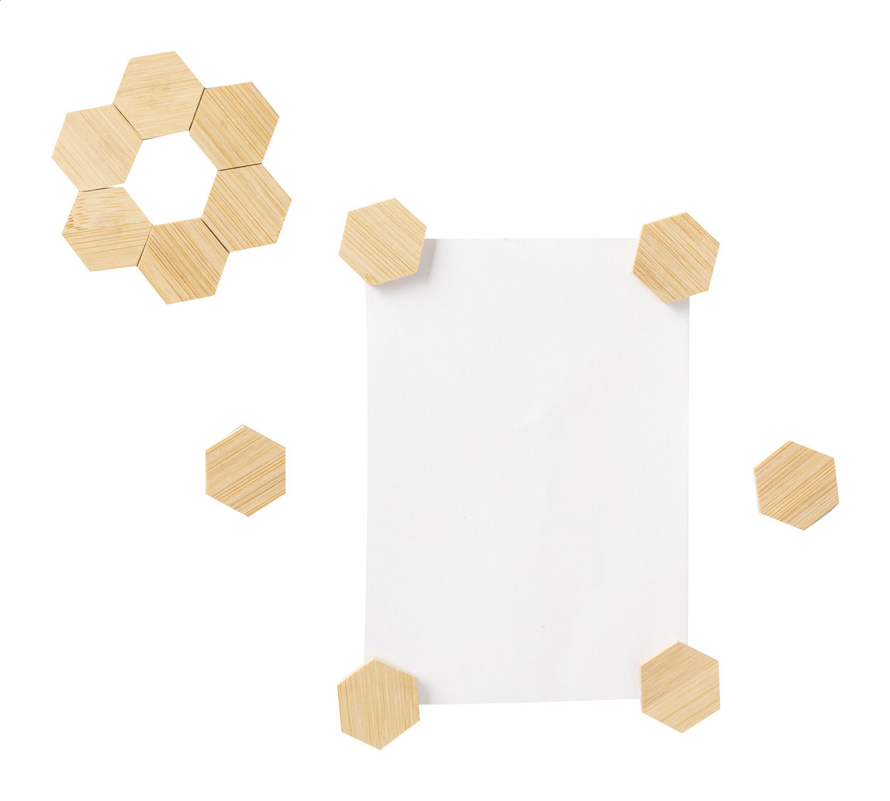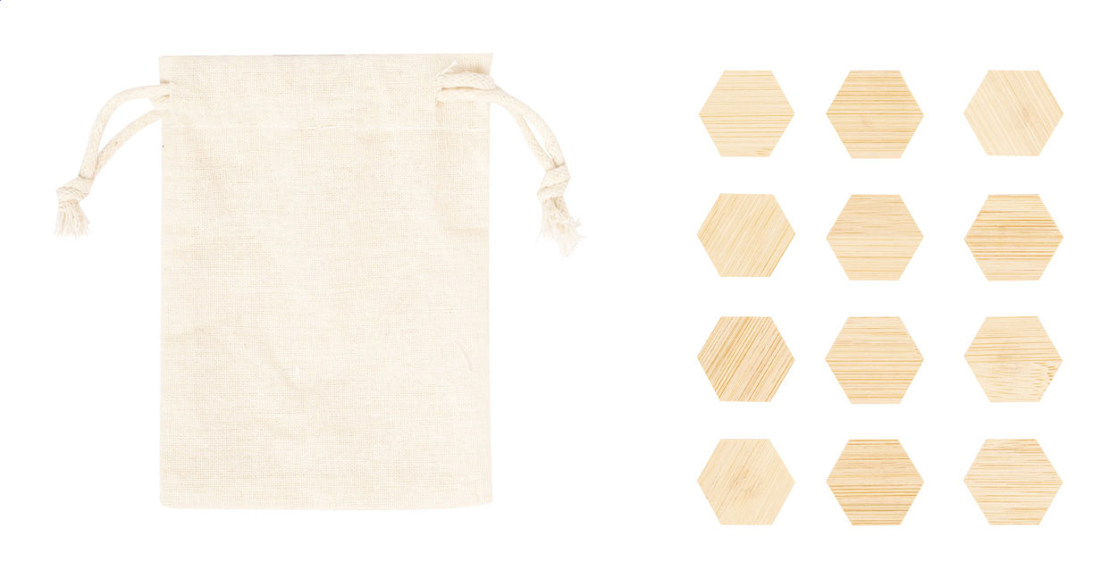 12-teiliges Kühlschrankmagnet-Set aus Bambus im Baumwollbeutel.