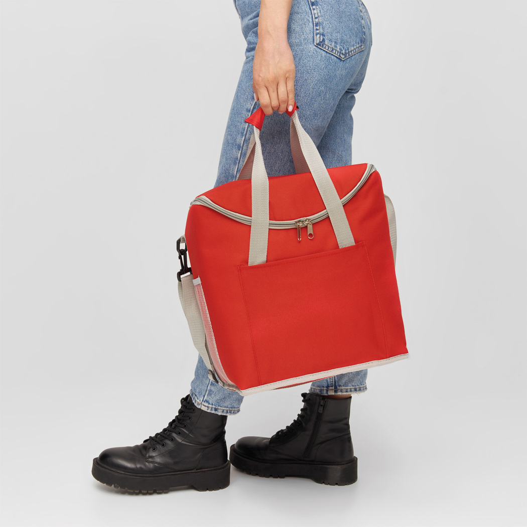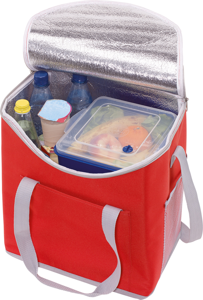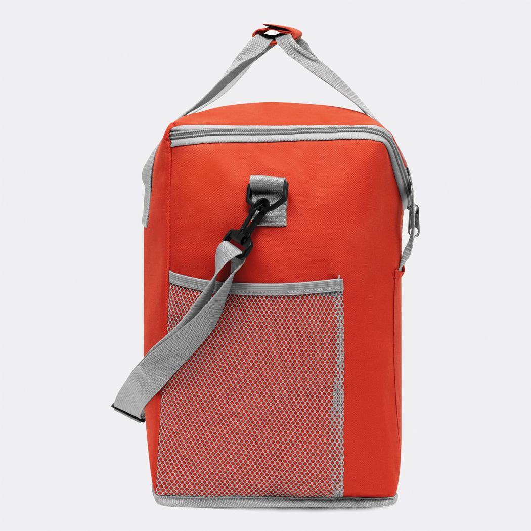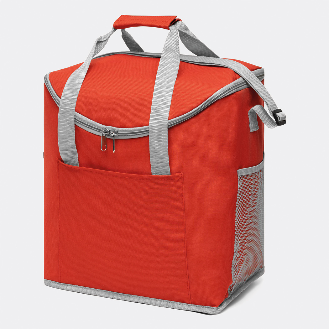 Kühltasche FROSTY: 1 Einsteckfach auf der Front, mit isoliertem Reißverschluss-Hauptfach, 2 seitliche Netz-Einsteckfächer, verstärkte Tragegriffe, verstell- und abnehmbarer Schultergurt – ideal für Picknick, Grillen und auf Reisen