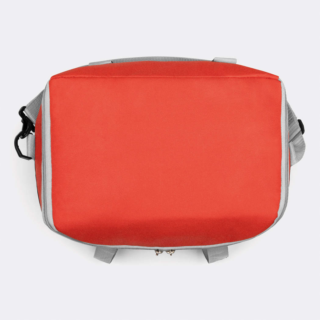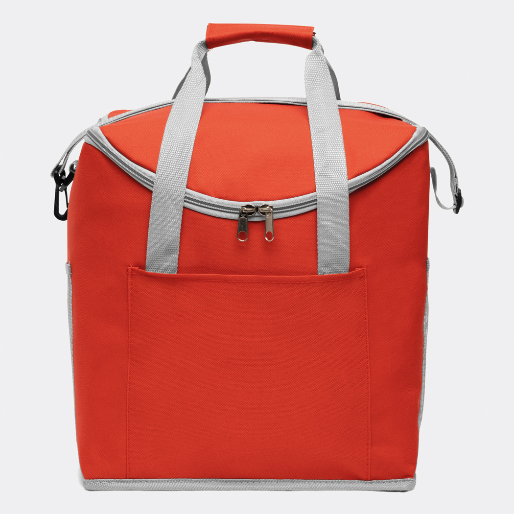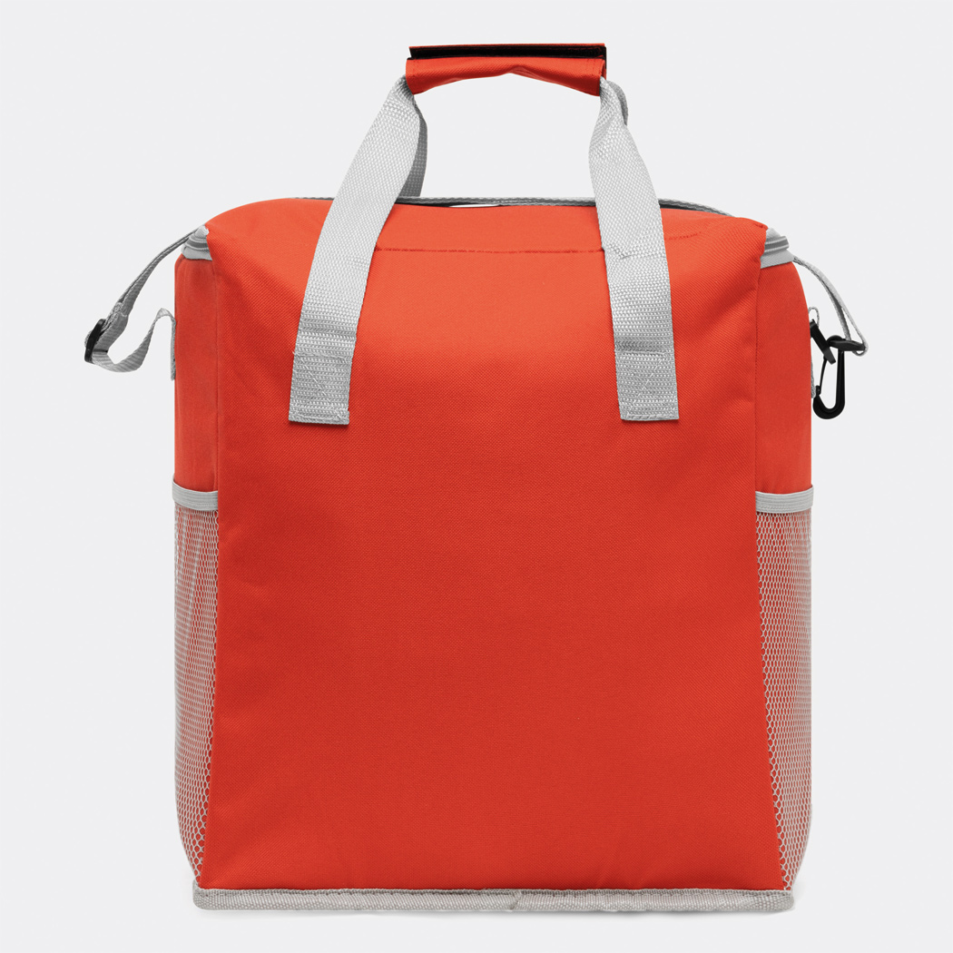 Kühltasche FROSTY: 1 Einsteckfach auf der Front, mit isoliertem Reißverschluss-Hauptfach, 2 seitliche Netz-Einsteckfächer, verstärkte Tragegriffe, verstell- und abnehmbarer Schultergurt – ideal für Picknick, Grillen und auf Reisen