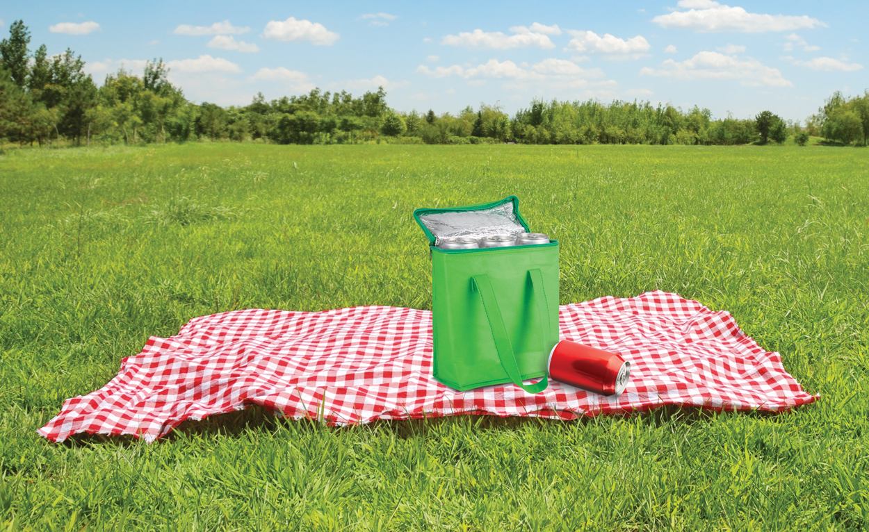 Kühltasche aus Non-Woven mit Reißverschluss und einer Innenbeschichtung aus geschäumter Thermofolie. Für 6 Getränkedosen (0,33 l) oder 3 Flaschen (0,5 l).