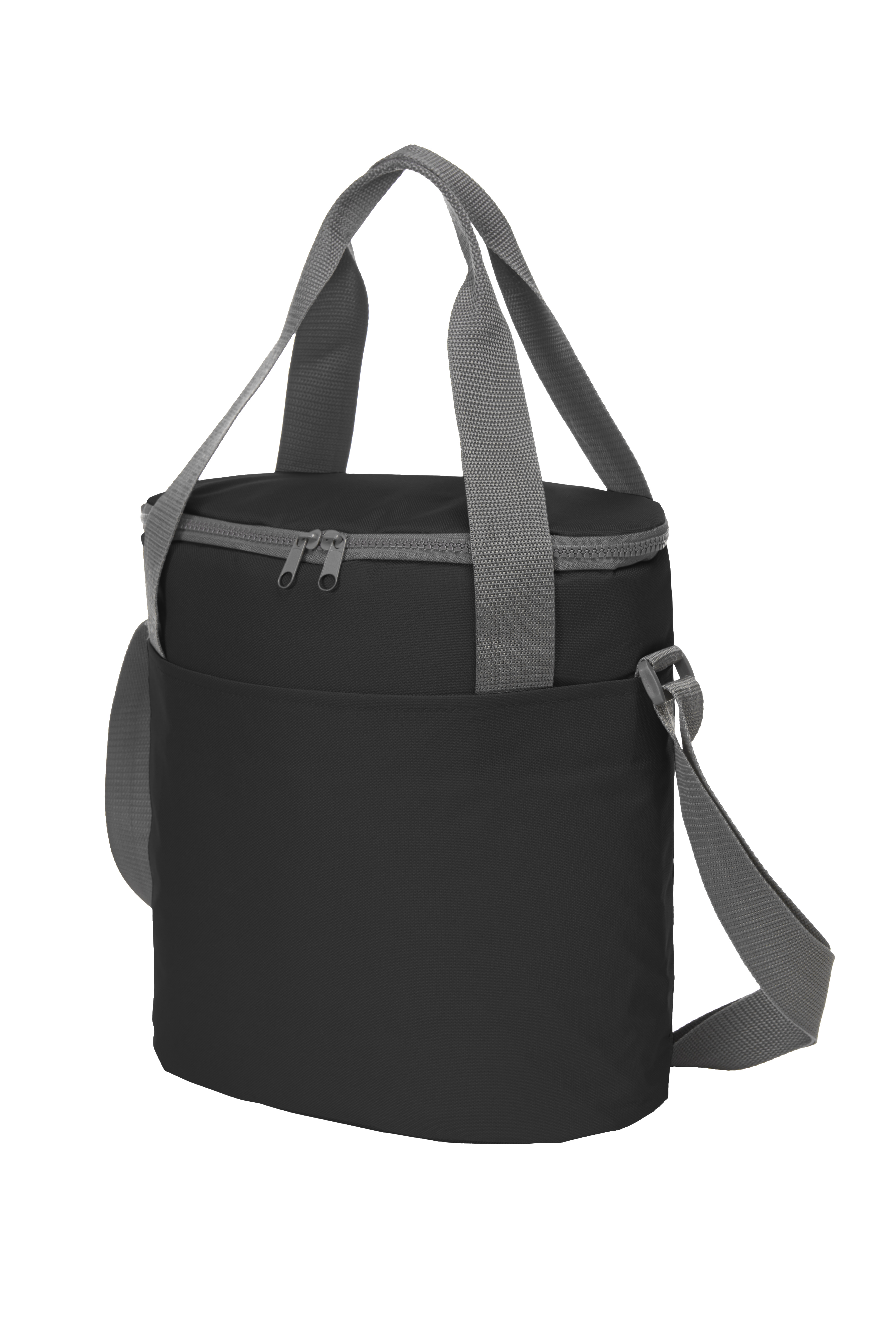 Großes Hauptfach mit 2-Wege-Reißverschluss geeignet für 5 x 1l-Flaschen; flache Vortasche; Handgriffe; längenverstellbarer Schultergurt