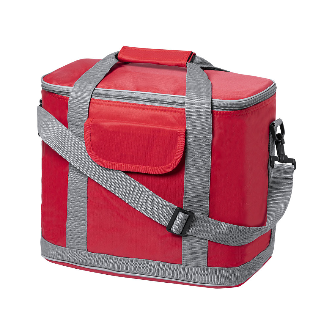 All-Terrain-Kühlbox aus strapazierfähigem 420D-Polyester, mit Hauptfach mit Reißverschluss und Fronttasche mit Klettverschluss. PEVA isothermischer Innenraum, mit verstellbarem Schultergurt und Karabinerhaken. Widerstandsfähigkeit bis zu 8 kg Gewicht.