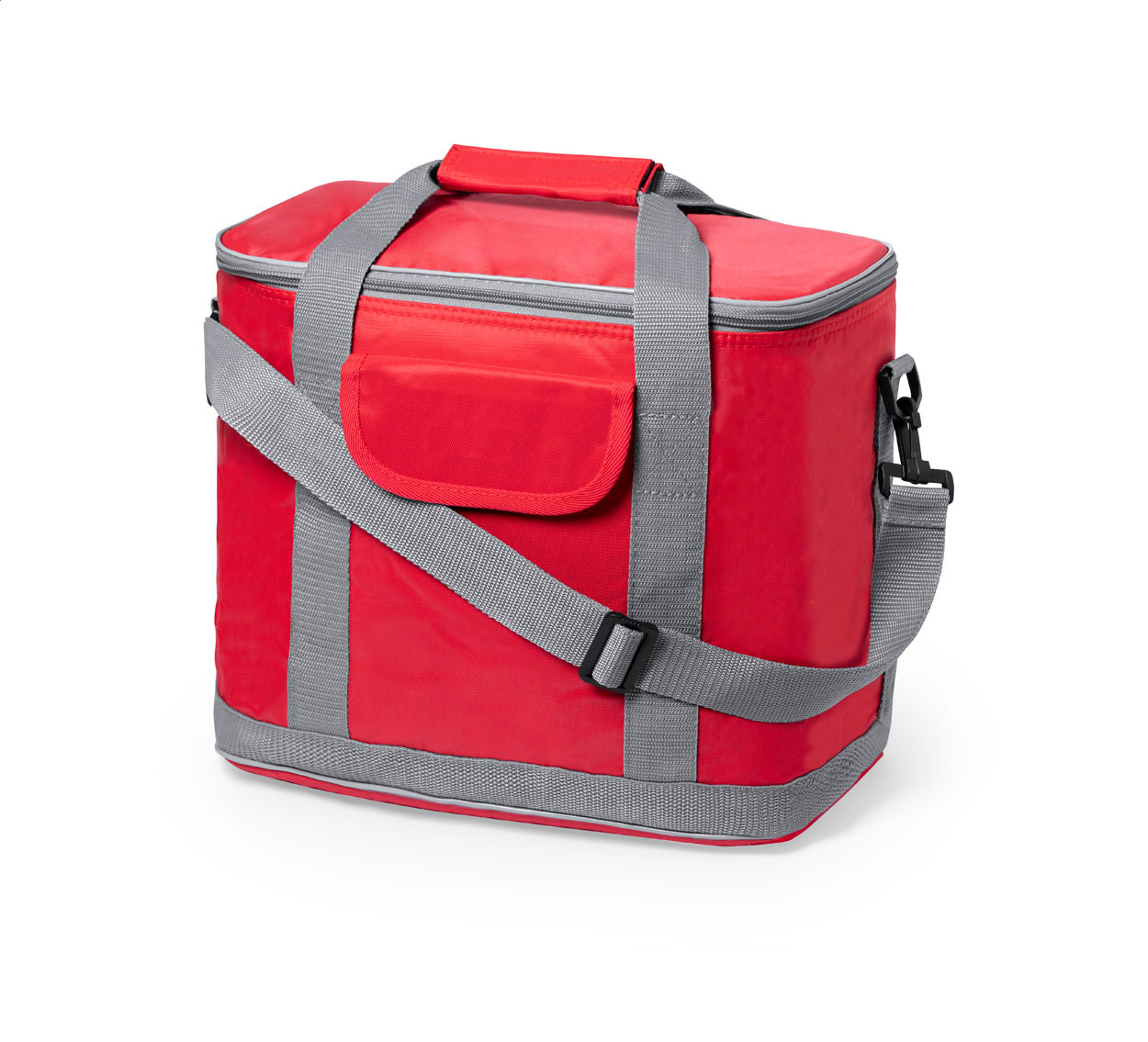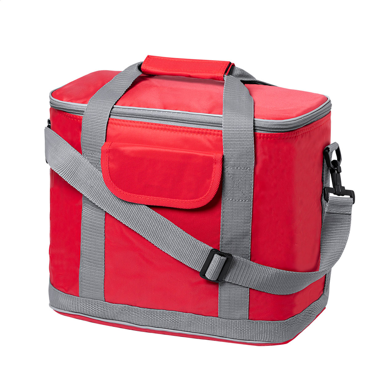 Kühltasche mit Reißverschluss aus 420D-Polyester mit PEVA-Polsterung. Mit Klettverschluss-Vortasche, Tragegriffen und verstellbarem Schultergurt.