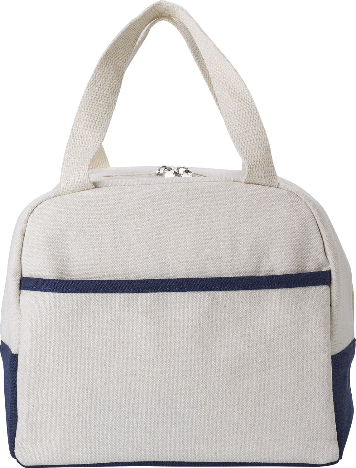Kühltasche aus Baumwolle (280 gr / m²) mit PEVA-Futter. Ein großes Fach mit Reißverschluss, eine kleine Fronttasche.