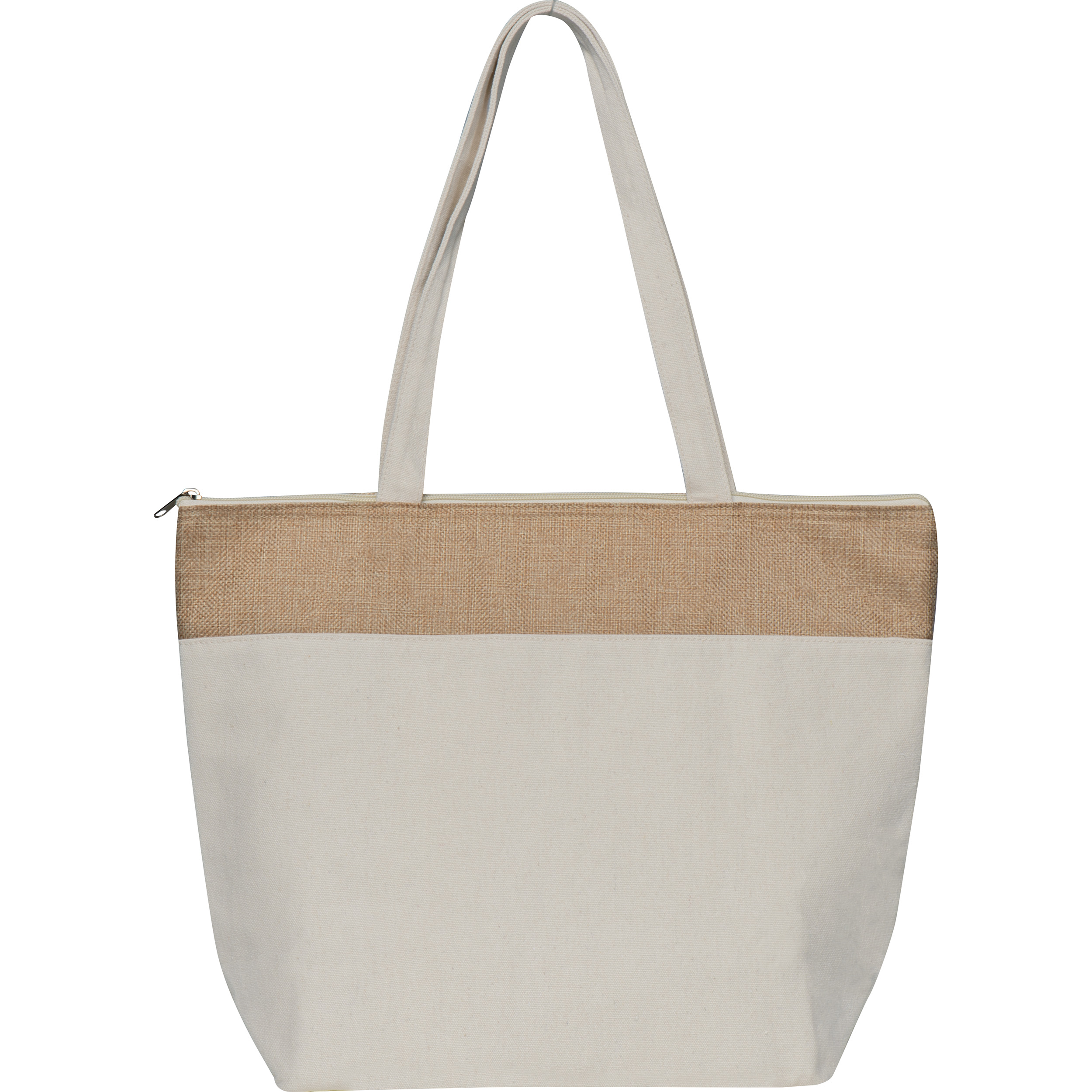 Kühltasche aus Baumwolle (200gsm) und laminierter Jute mit isolierender Innenseite aus Aluminium und Reißverschluss. Die Werbung wird auf eine Seite gedruckt.