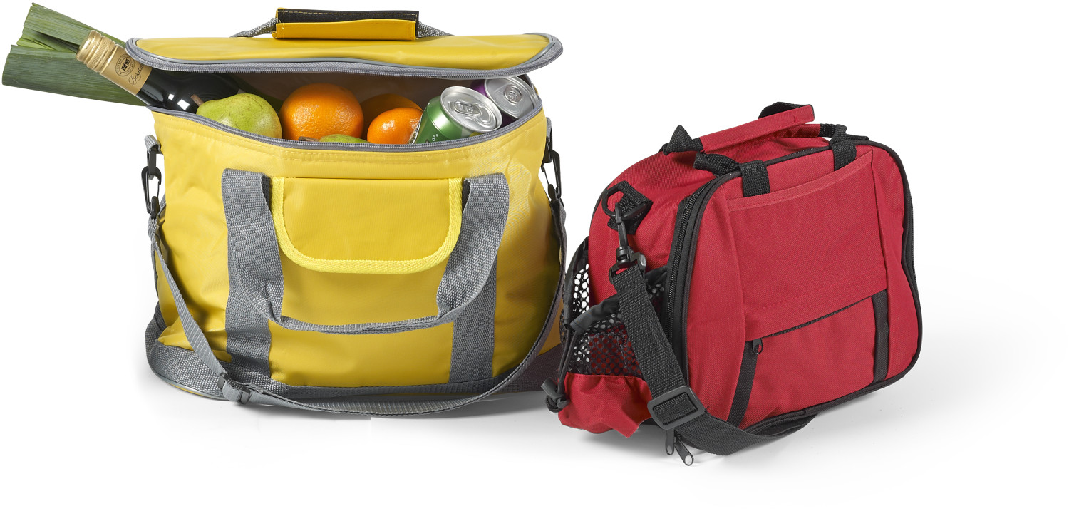 Kühltasche aus Nylon (420D) mit Klettverschluss-Frontfach, abnehmbarem Schultergurt und Tragegriffen.