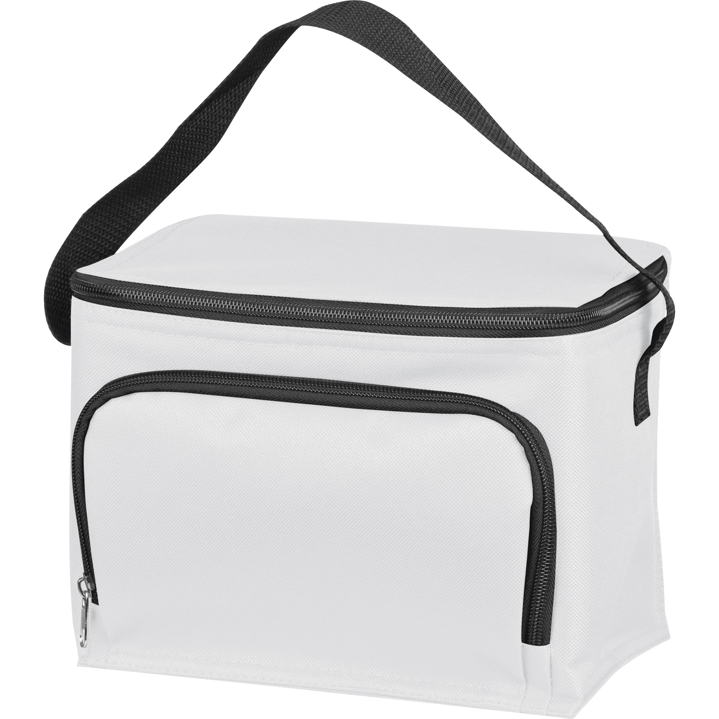 Kühltasche aus 210D Polyester mit Reißverschlussvorfach und Tragehenkel aus Nylon. Passend für 6 Getränkedosen (0,5 Liter), kleine Flaschen oder alles, das sonst noch frisch bleiben soll. Ihre Werbung drucken wir mittig auf den Deckel.