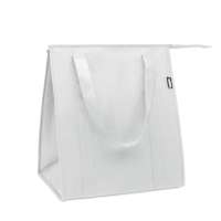 Kühltasche aus laminiertem Vliesstoff mit Griffen, Klettverschluss und Aluminiumpolsterung.