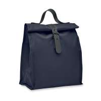 Kühltasche aus recycelter Baumwolle und recyceltem Polyester. Die Tasche verfügt über einen Tragegriff, einen breiten Klettverschluss zum Verschließen und ein Vorfach. Ihre Werbung drucken wir auf das Vorfach