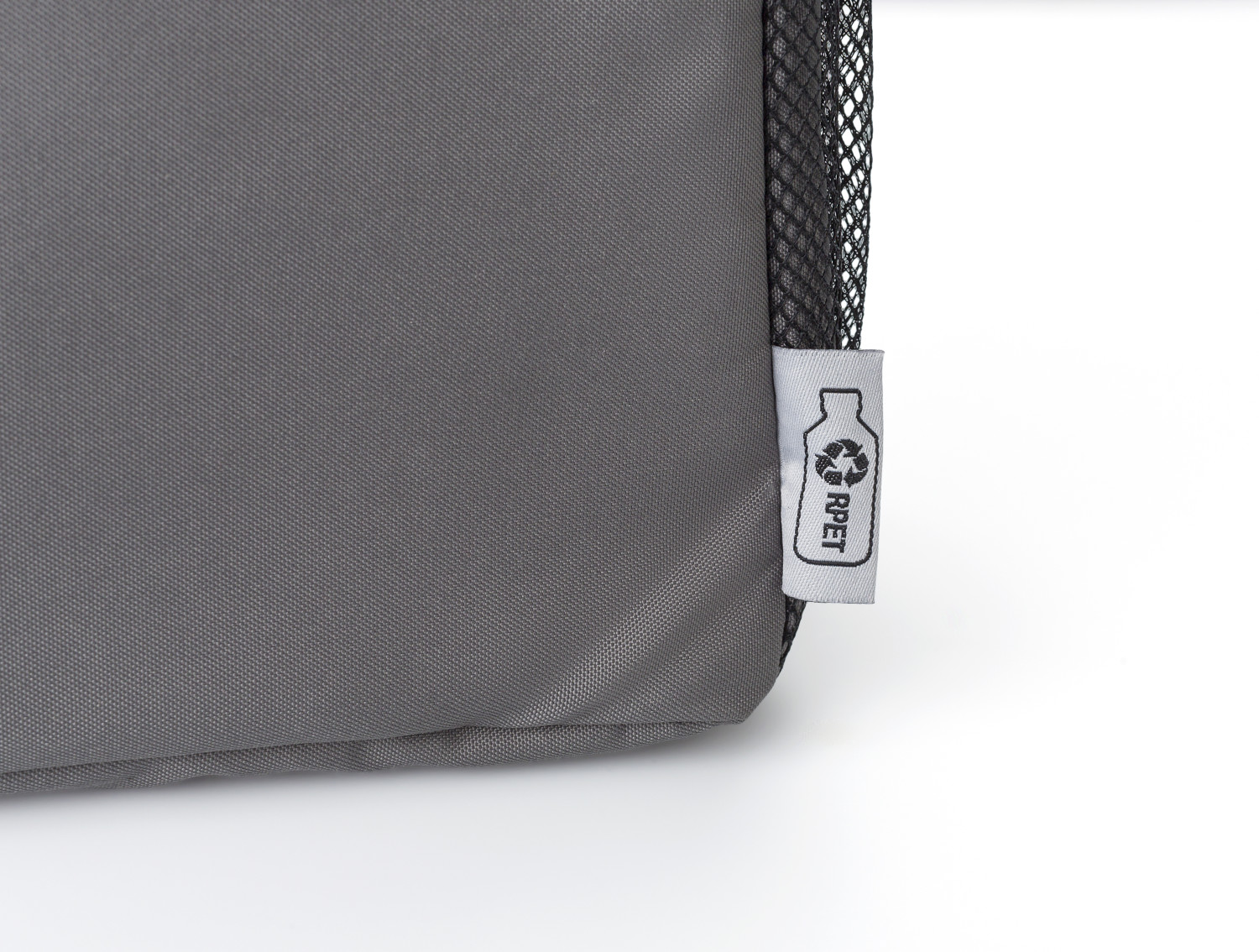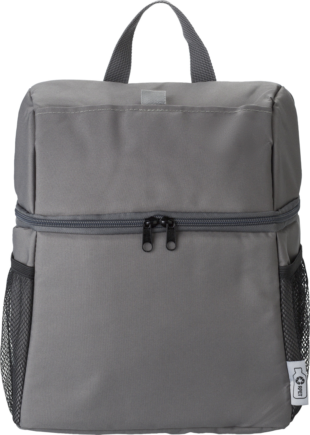 Kühlrucksack aus recyceltem Polyester (300D / PU rPET) mit PEVA (13C) Futter. Eine Fronttasche mit Klettverschluss, zwei Netztaschen an der Seite. Verstellbare Schultergurte.