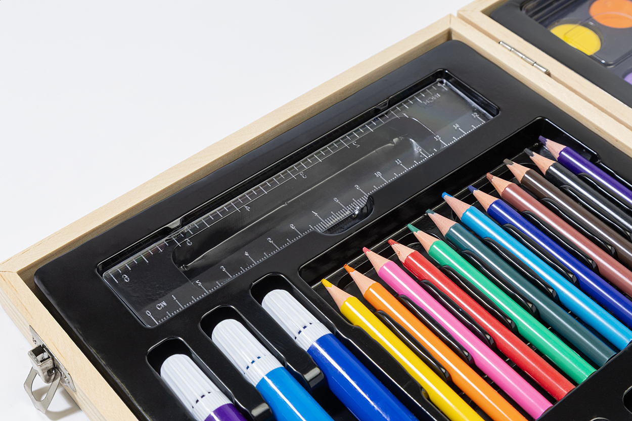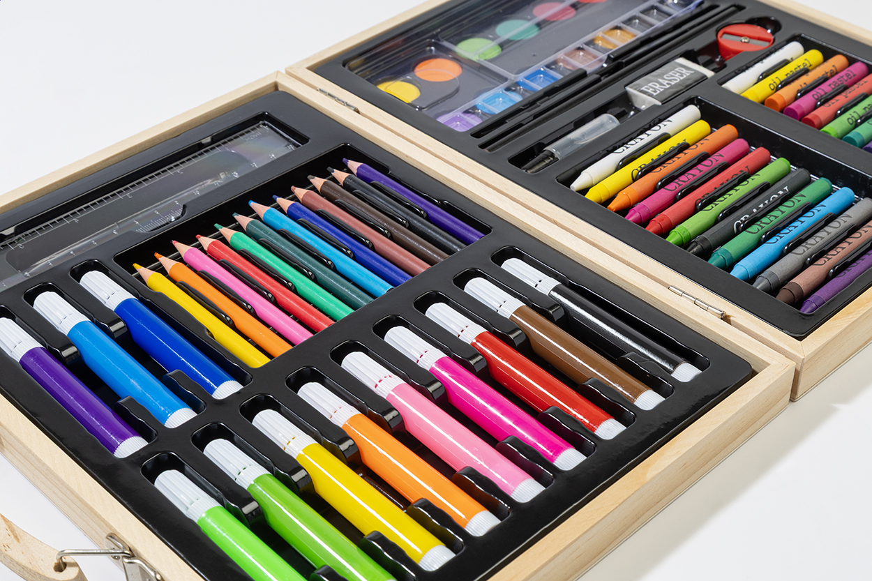 Umfangreiches 66-teiliges Künstler-Zeichen- und Malset in einem Holzkoffer. Inhalt: 12 Wachsmalstifte, 12 Ölpastellkreiden, 12 Buntstifte, 12 Filzstifte, 12 Aquarellfarben mit Palette und Pinsel, Lineal, Radiergummi, Anspitzer und Klebstoff.
