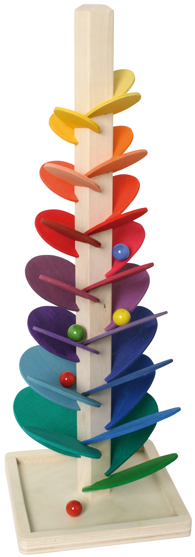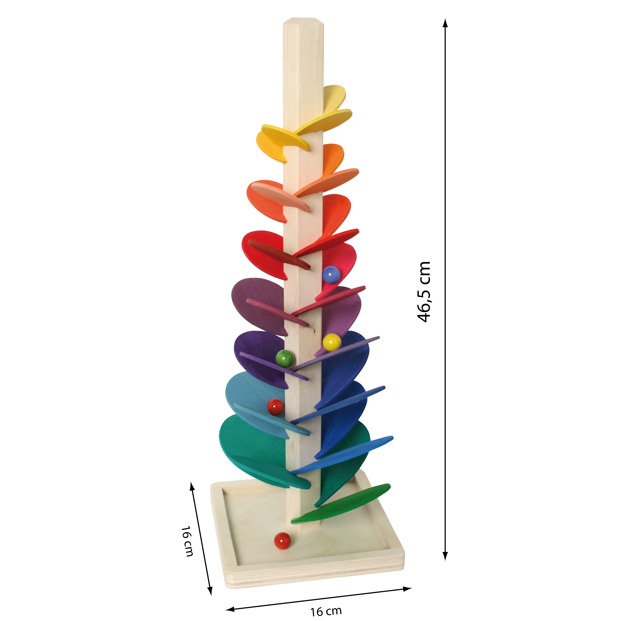 Die hochwertige, farbige Klangbahn aus Holz ist ein ganz neues Deko-Spiel-Sinnes-Erlebnis für Klein und Groß! Wenn die Murmeln über die Blätter hinunter laufen, erklingen einzelne Töne. Je tiefer die Murmeln hinunter rollen, desto dunkler werden die Blätterfarben und desto tiefer wird der Klang! Höhe: 47 cm. Jedes Blatt hat eine andere Regenbogenfarbe!