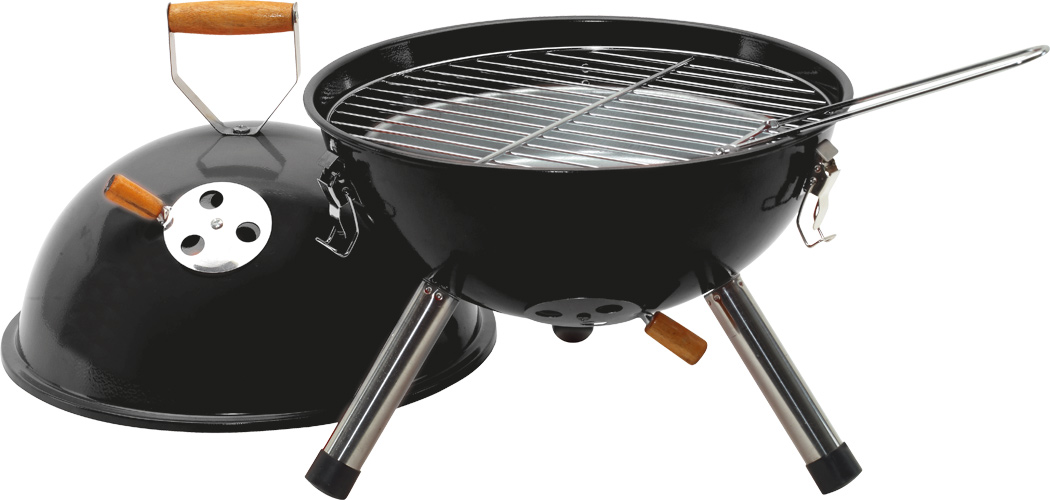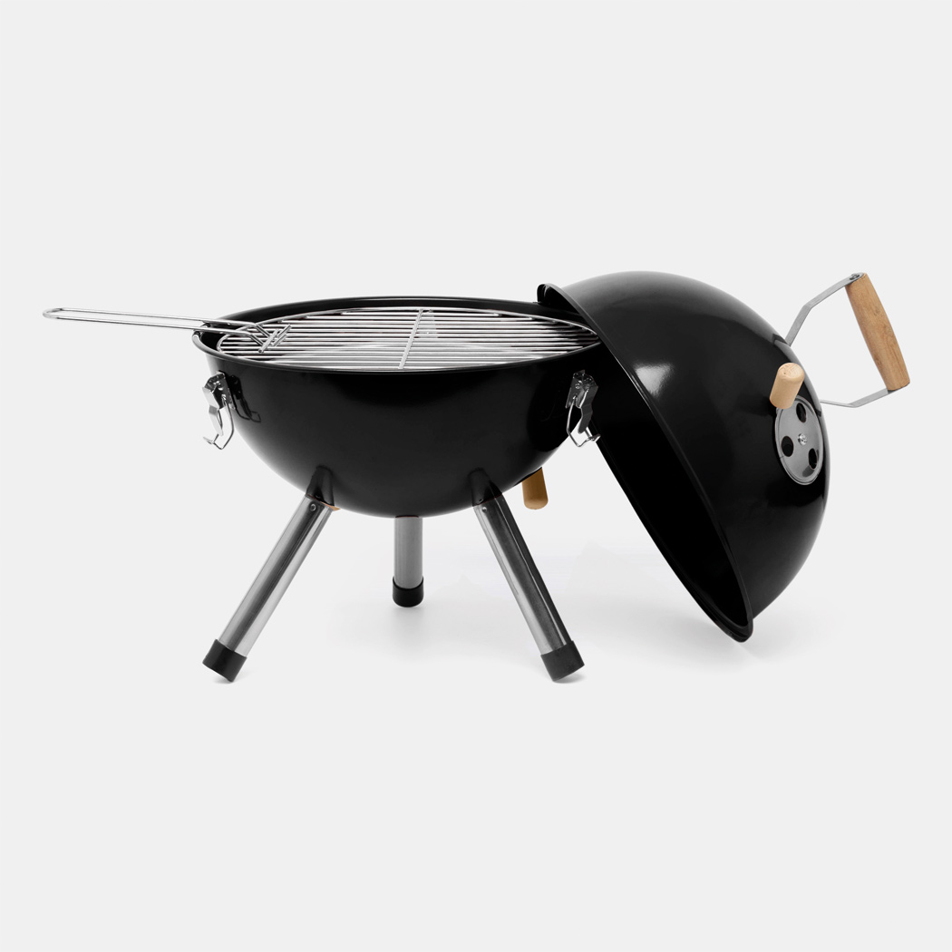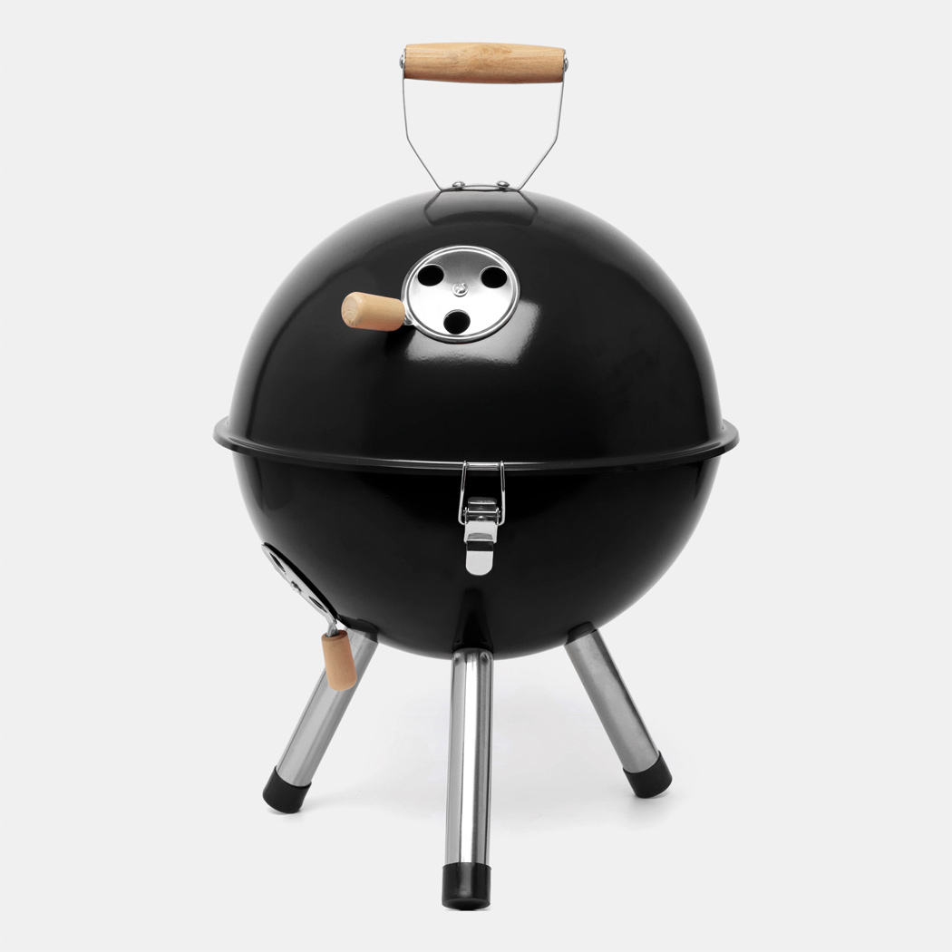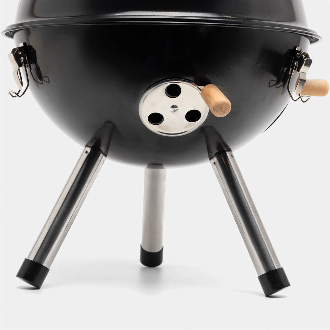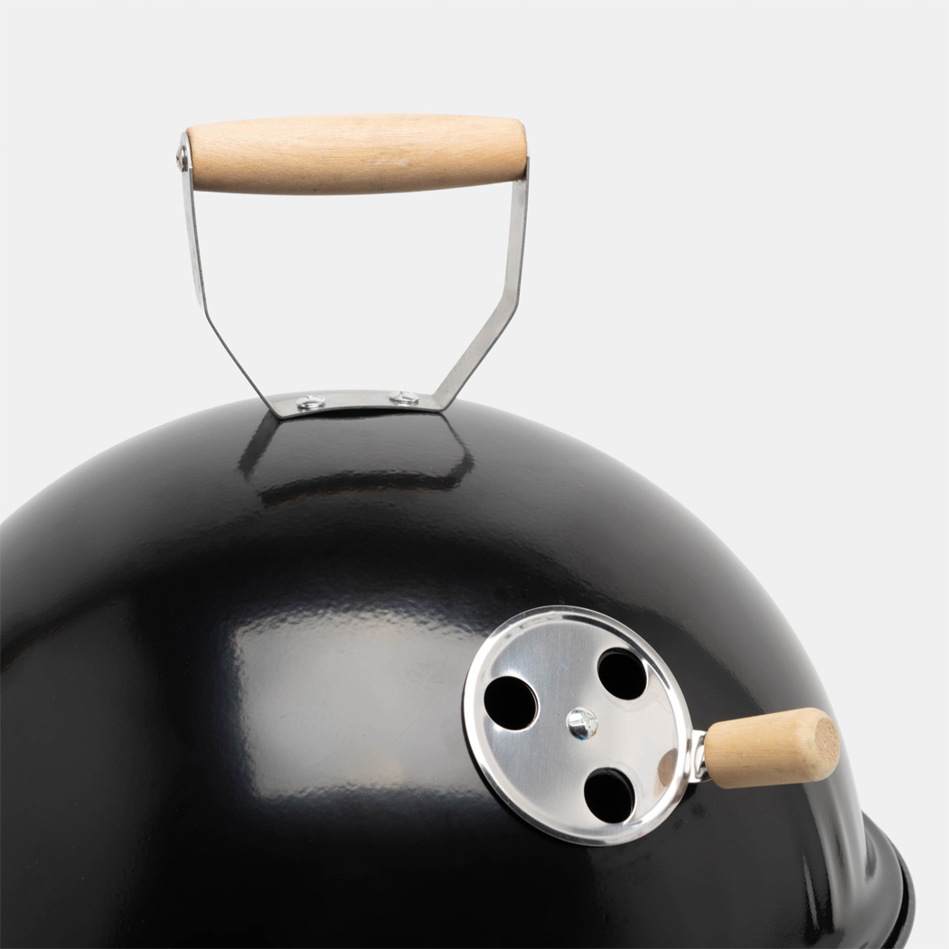 Kugelgrill COOKOUT: Metall-Korpus mit 2 Belüftungsfenstern, herausnehmbare Schale mit Luftlöchern für Kohle, herausnehmbarer Grillrost Ø ca. 29 cm, Garhaube mit Belüftungsfenster und Holzgriff, 3 Schnappverschlüsse zum Befestigen der Haube am Metall-Korpus, 3 Metallfüße mit Kunststoffkappen, in Box