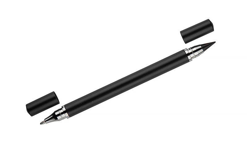 Der TWINO 2-in-1-Kugelschreiber vereint einen klassischen Kugelschreiber und einen Füllfederhalter in einem Gehäuse und ist damit ein praktisches Werkzeug für den täglichen Gebrauch. Auf der einen Seite befindet sich ein Kugelschreiber mit Stopper und einer Mine mit 1,0 mm Schreibstärke, auf der anderen Seite ein Füllfederhalter, der nicht angespitzt werden muss. Der Schaft ist aus satiniertem Kunststoff gefertigt und mit silbernen Ringen verziert, die sein edles Aussehen unterstreichen. TWINO ist leicht, handlich und komfortabel, ideal für das Büro, die Schule oder als funktionales Werbegeschenk.