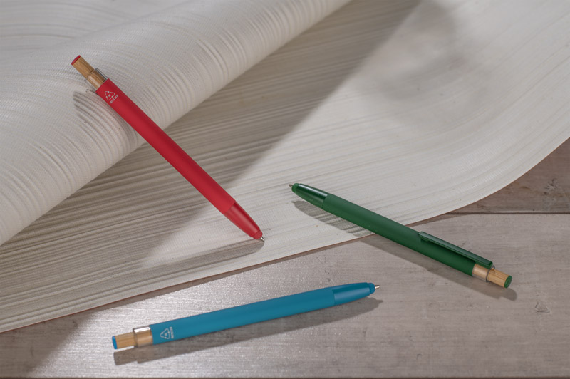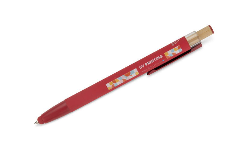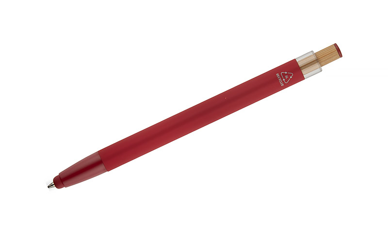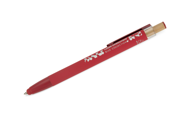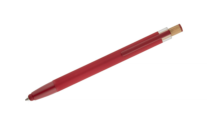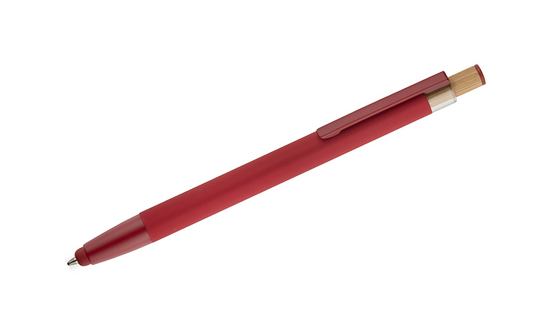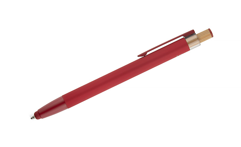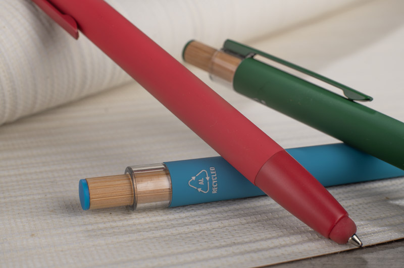 Der Kugelschreiber ALPEN vereint modernes Design und Schreibkomfort. Er ist aus recyceltem Aluminium gefertigt und mit einer gummierten Soft-Touch-Oberfläche versehen, so dass er jeden Tag bequem benutzt werden kann. Er verfügt über eine Touch-Pen-Funktion für Touchscreens und einen Metallclip zur einfachen Befestigung an einem Notebook oder einer Tasche. Der markante Bambusknopf verleiht ihm einen natürlichen Touch und die farbigen Details unterstreichen seinen modernen Stil. Die G2-Feder mit einer Strichstärke von 1,0 mm garantiert ein flüssiges Schreiben und eine lange Lebensdauer.