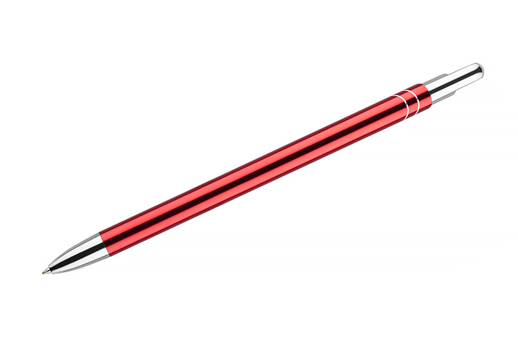 Dünner und schlanker Metallkugelschreiber in Farbe mit einem metallischen Finish. Clip und Spitzen in Silberchrom. AVALO zeichnet sich unter ähnlichen Kugelschreibern mit einem originellen Design des Clips aus. Der Körper ist mit zwei diagonalen Streifen in Silber verziert. Die Mine mit einer Dicke von 0,7 mm in blau.