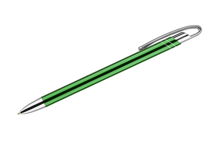 Dünner und schlanker Metallkugelschreiber in Farbe mit einem metallischen Finish. Clip und Spitzen in Silberchrom. AVALO zeichnet sich unter ähnlichen Kugelschreibern mit einem originellen Design des Clips aus. Der Körper ist mit zwei diagonalen Streifen in Silber verziert. Die Mine mit einer Dicke von 0,7 mm in blau.