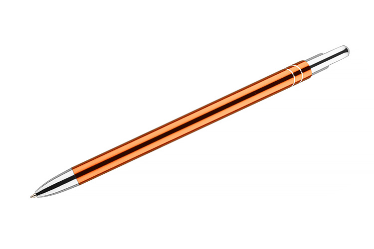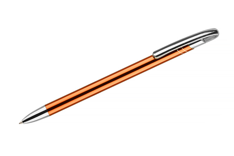 Dünner und schlanker Metallkugelschreiber in Farbe mit einem metallischen Finish. Clip und Spitzen in Silberchrom. AVALO zeichnet sich unter ähnlichen Kugelschreibern mit einem originellen Design des Clips aus. Der Körper ist mit zwei diagonalen Streifen in Silber verziert. Die Mine mit einer Dicke von 0,7 mm in blau.