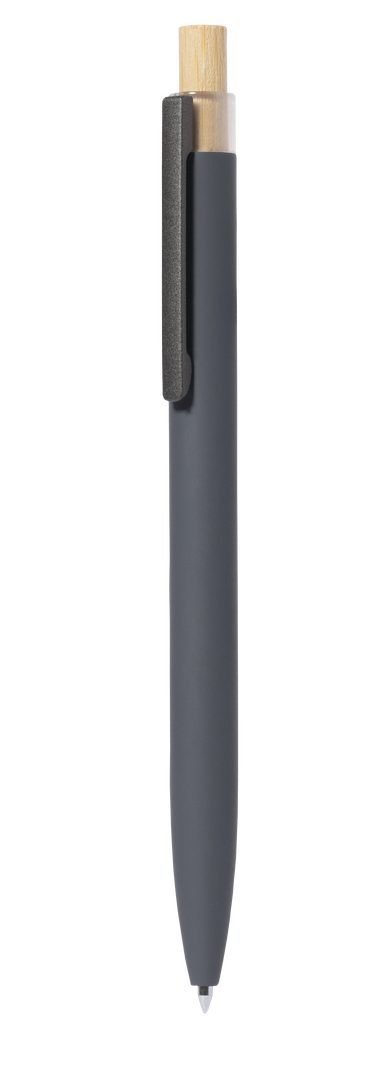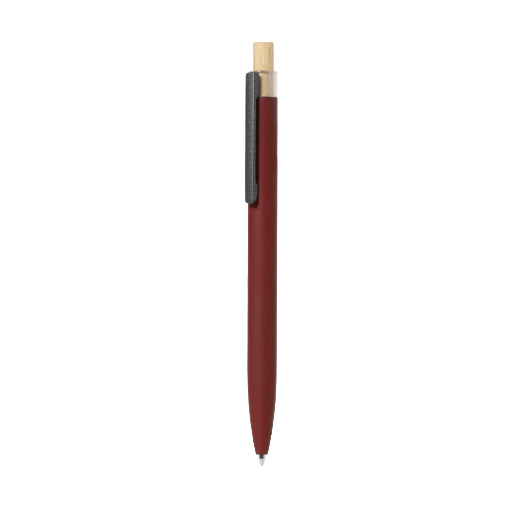 Kugelschreiber mit Druckknopfmechanismus aus recyceltem Aluminium. Druckknopf aus Bambus und gummierter Schaft, erhältlich in einer Reihe von eleganten Farben. Metallischer Clip und markante Kappe aus recyceltem Aluminium auf der Oberseite des Stiftes. Jumbo-Patrone mit blauer Tinte. Präsentiert in einem individuellen, recycelten Etui. Recyceltes Aluminium ist ein Material mit nahezu unendlichen Recyclingmöglichkeiten, das seine ursprünglichen Eigenschaften nicht verliert und dabei weniger Energie verbraucht. GRS-Zertifizierung (Global Recycled Standard), die die recycelte Herkunft des für die Herstellung des Produkts verwendeten Materials garantiert.
