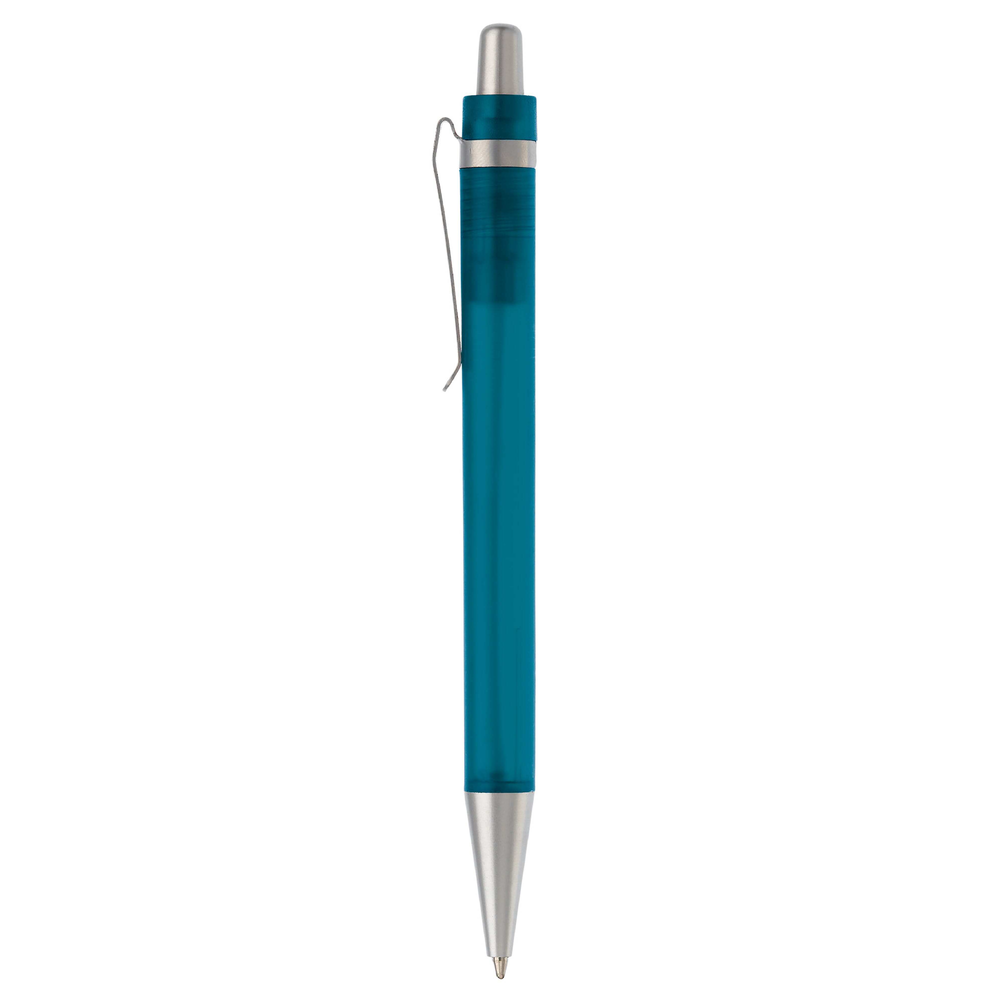 Transparenter Kunststoffkugelschreiber mit Metallclip und blauschreibender mit X20-Mine.